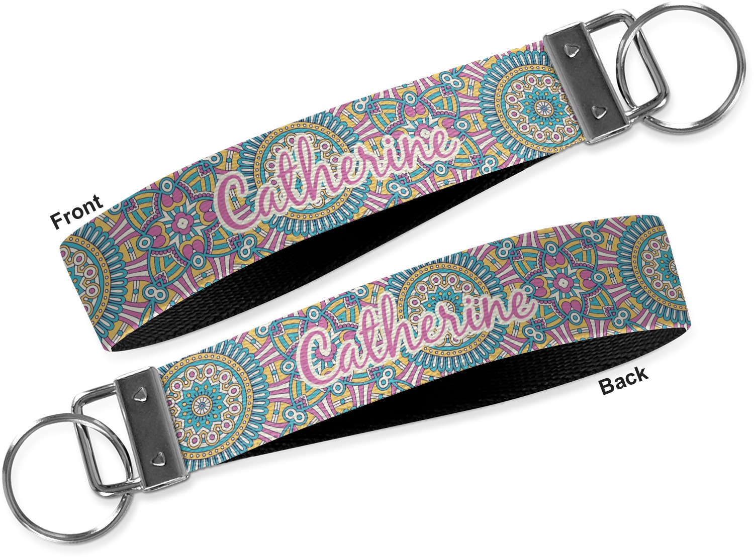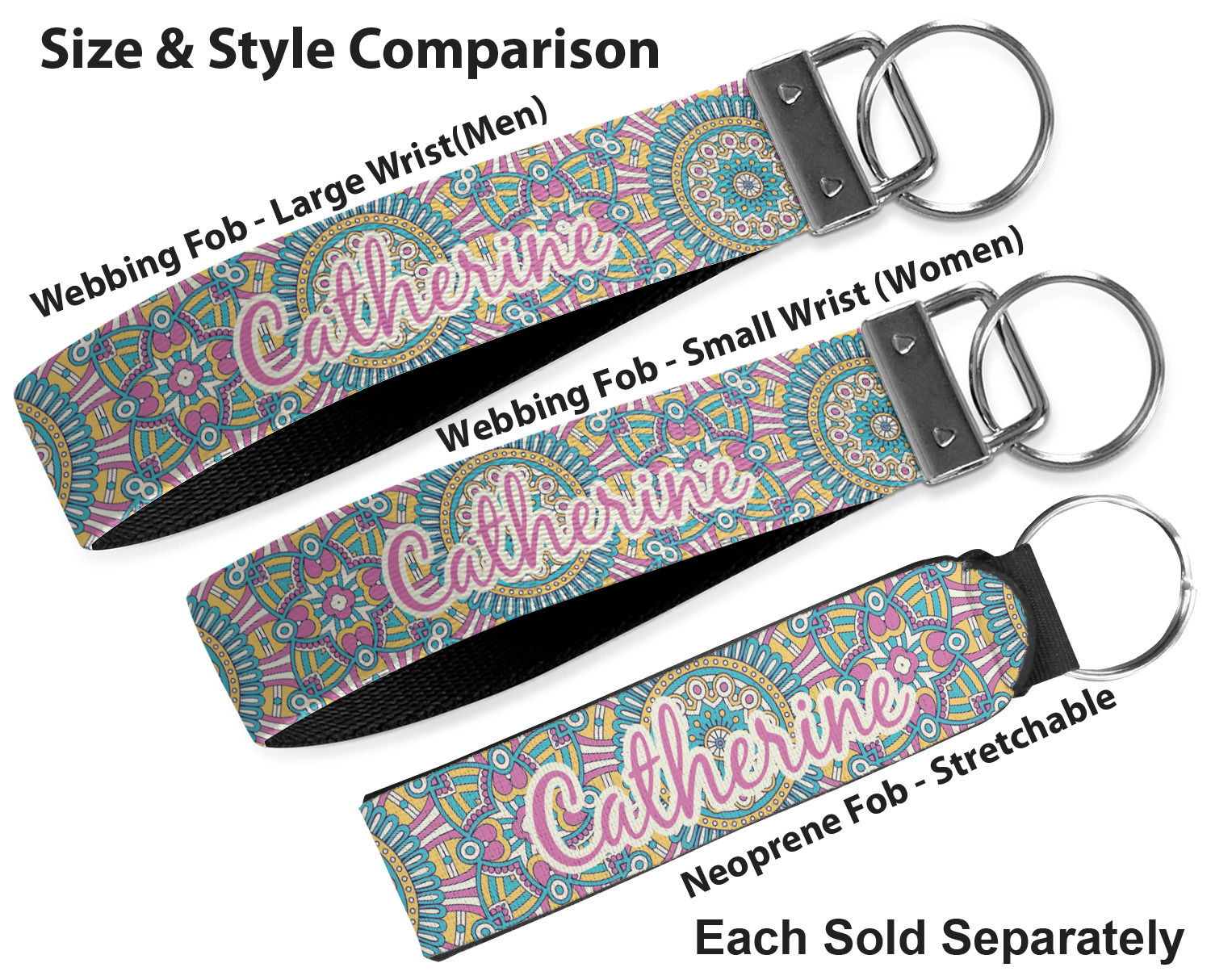 These key fob keychains are made from a polyester weave, right here in the USA. They feature a silver, metal clasp, attached to a round keyring. The piece gives the personalized wristlet a beautiful, finished look. Your customized design is printed on the outside of the keychain strap. We carry these wristlets in two sizes: small, which is 5 inches in width, and large, which is 5.5 inches in width.