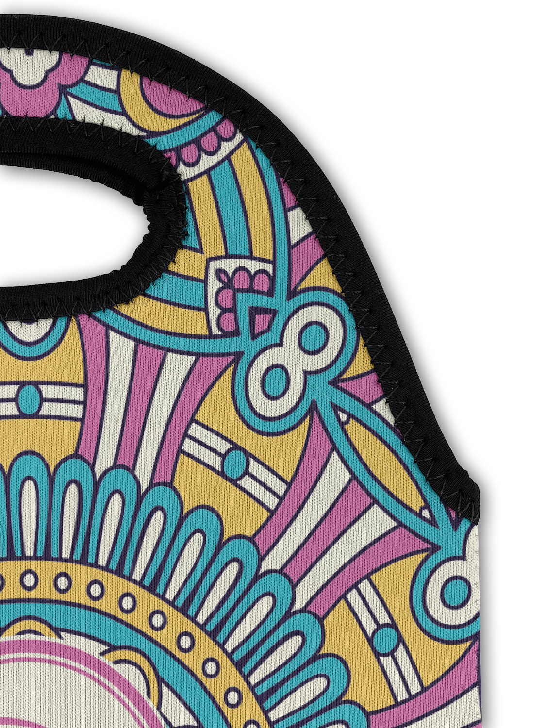 The designs main feature is its beautiful pattern. The pattern is filled with intricate detail and bohemian style shapes. The colors are a drastic difference from what you would normally see in a bohemian design, making this design all the more unique. You are able to put your personalization in the frame in the middle. The colors you will find are a bubble gum pink, teal, light yellow, and white.