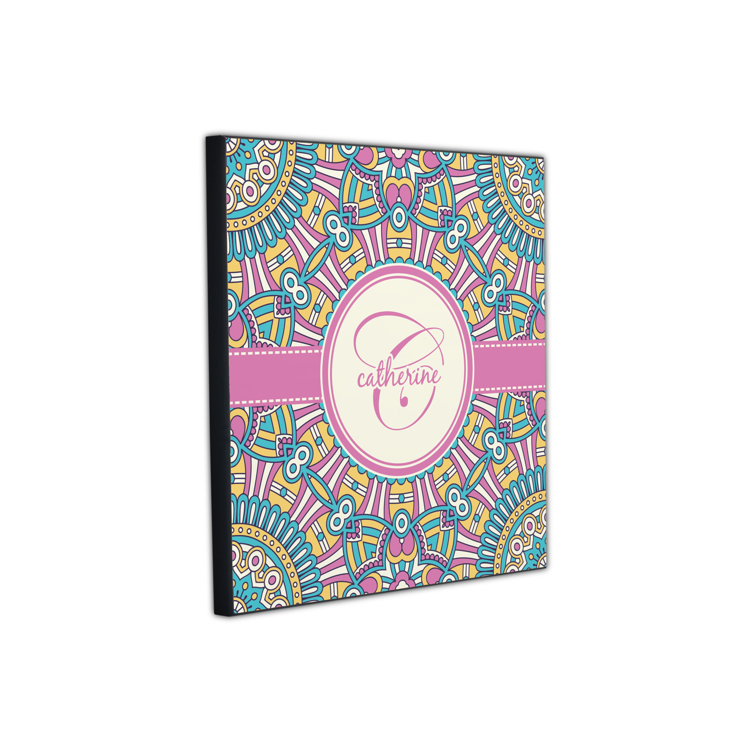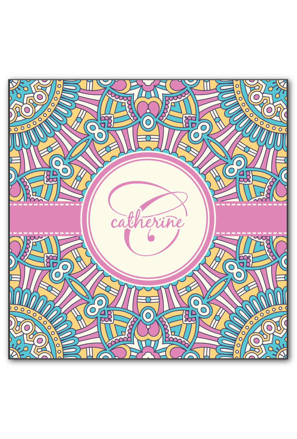 The designs main feature is its beautiful pattern. The pattern is filled with intricate detail and bohemian style shapes. The colors are a drastic difference from what you would normally see in a bohemian design, making this design all the more unique. You are able to put your personalization in the frame in the middle. The colors you will find are a bubble gum pink, teal, light yellow, and white.