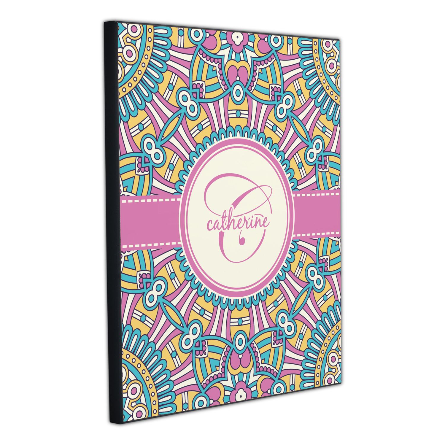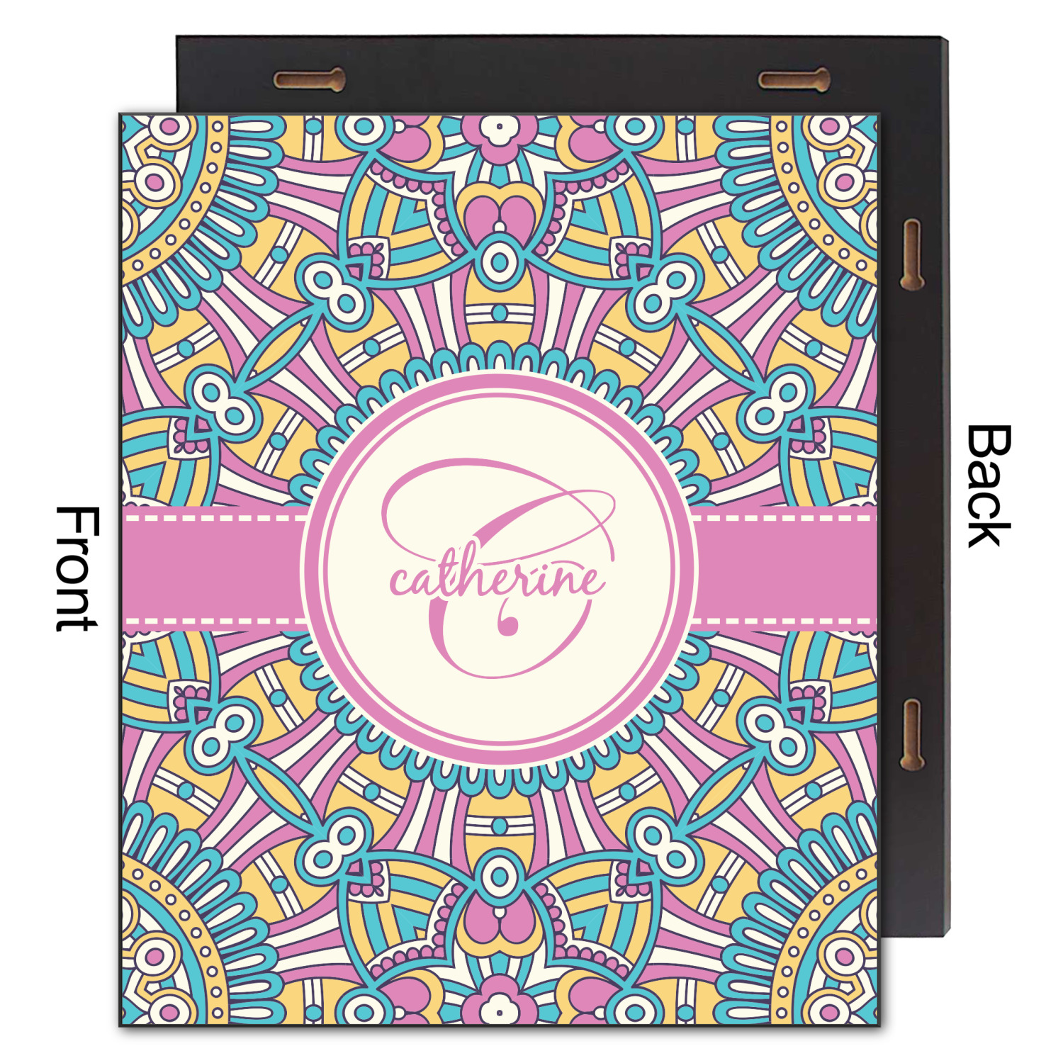 The designs main feature is its beautiful pattern. The pattern is filled with intricate detail and bohemian style shapes. The colors are a drastic difference from what you would normally see in a bohemian design, making this design all the more unique. You are able to put your personalization in the frame in the middle. The colors you will find are a bubble gum pink, teal, light yellow, and white.