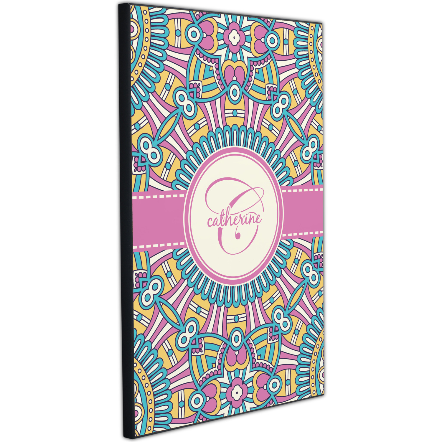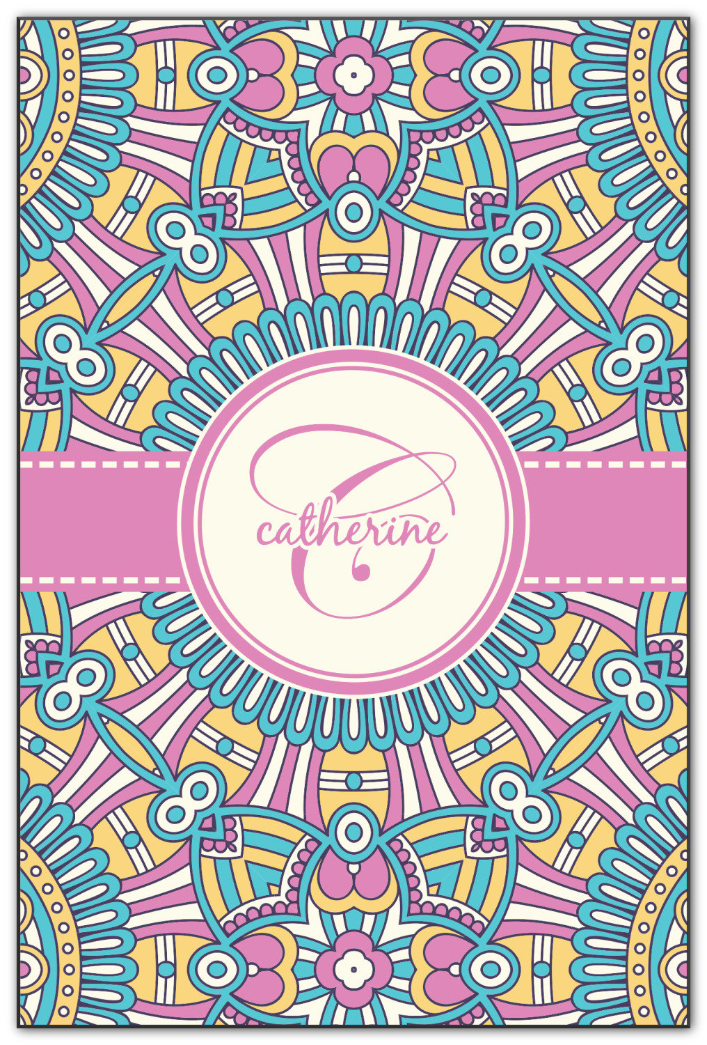 The designs main feature is its beautiful pattern. The pattern is filled with intricate detail and bohemian style shapes. The colors are a drastic difference from what you would normally see in a bohemian design, making this design all the more unique. You are able to put your personalization in the frame in the middle. The colors you will find are a bubble gum pink, teal, light yellow, and white.