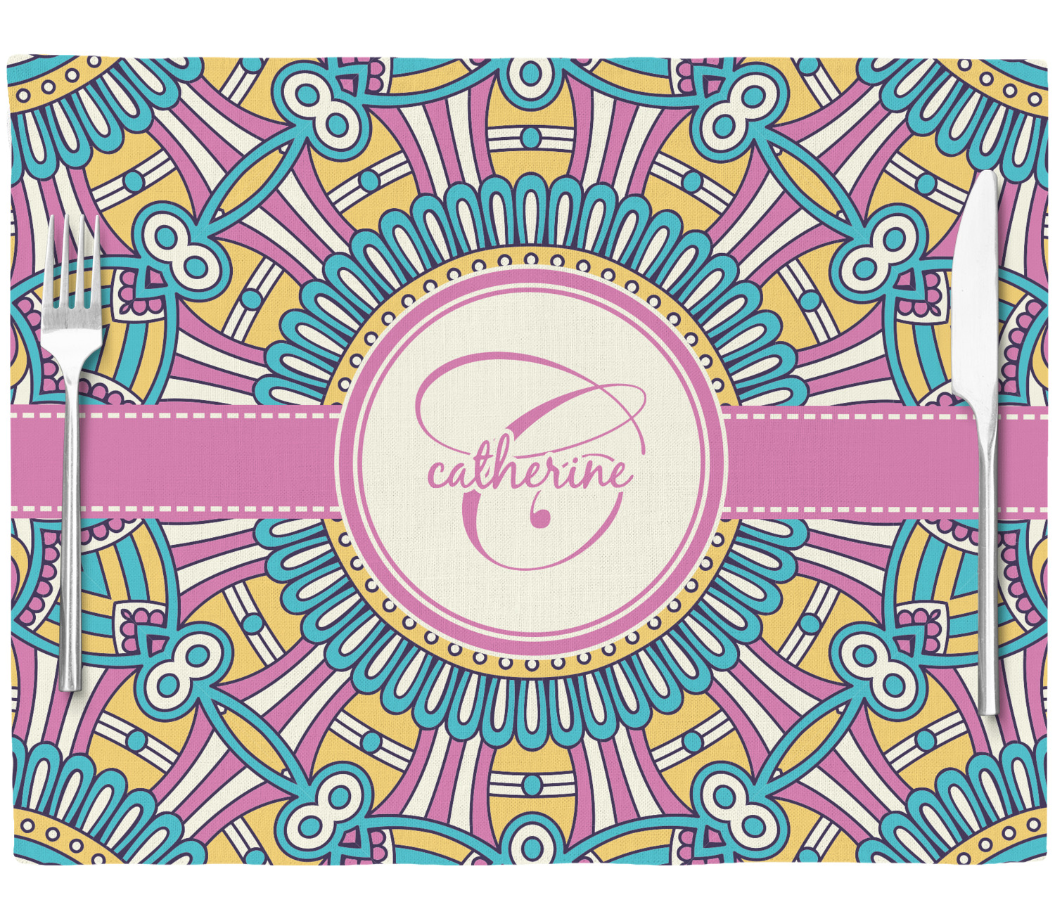 Each of our table mats are a poly twill material with woven burlap detailing. This creates a soft, quality placemat for us to fully print your personalized design across. The woven twill also adds a wrinkle-free surface to set your table! Each customizable placemat is a rectangle shape measuring at approximately 13 x 18 and printed here in the USA.