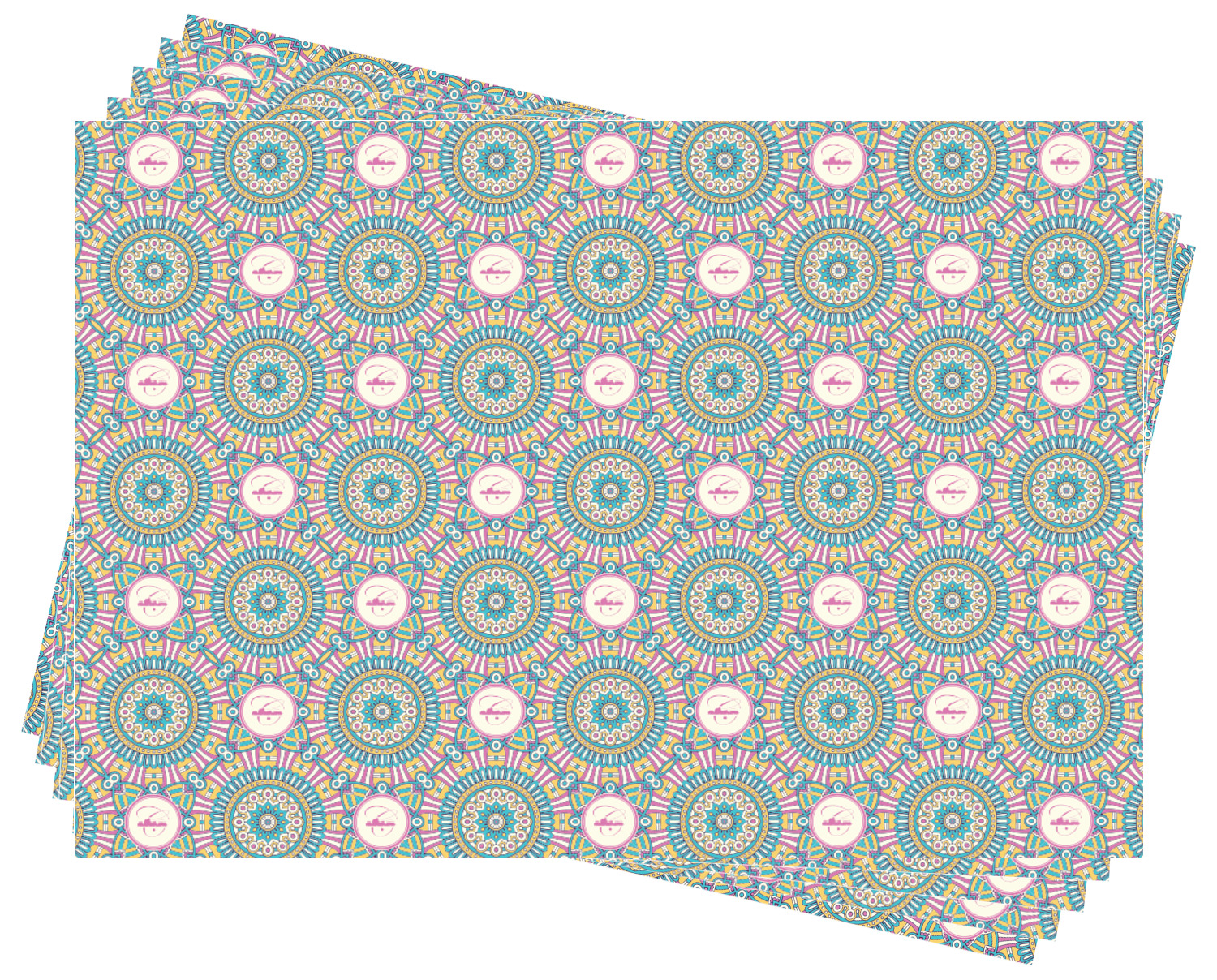 The designs main feature is its beautiful pattern. The pattern is filled with intricate detail and bohemian style shapes. The colors are a drastic difference from what you would normally see in a bohemian design, making this design all the more unique. You are able to put your personalization in the frame in the middle. The colors you will find are a bubble gum pink, teal, light yellow, and white.