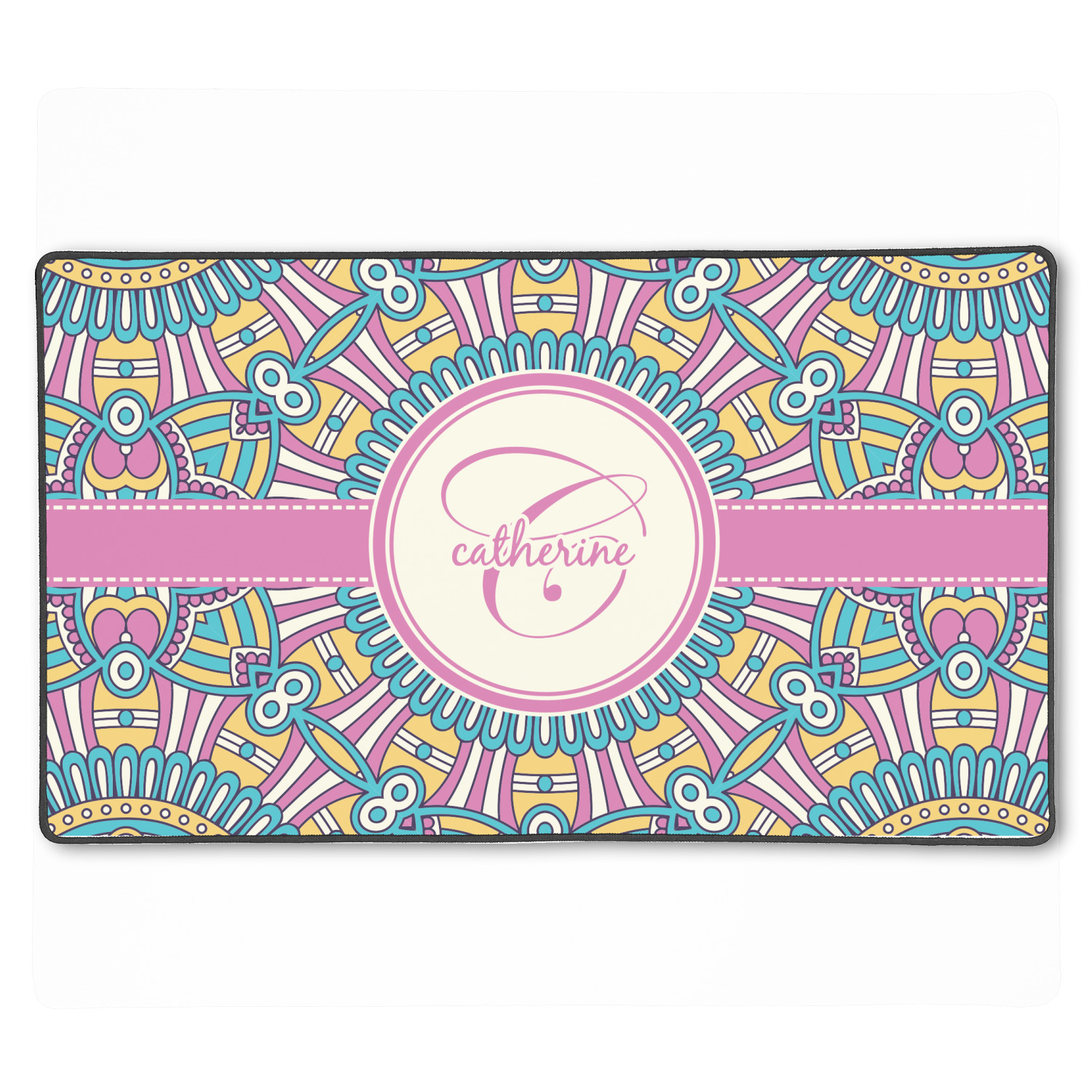 The designs main feature is its beautiful pattern. The pattern is filled with intricate detail and bohemian style shapes. The colors are a drastic difference from what you would normally see in a bohemian design, making this design all the more unique. You are able to put your personalization in the frame in the middle. The colors you will find are a bubble gum pink, teal, light yellow, and white.