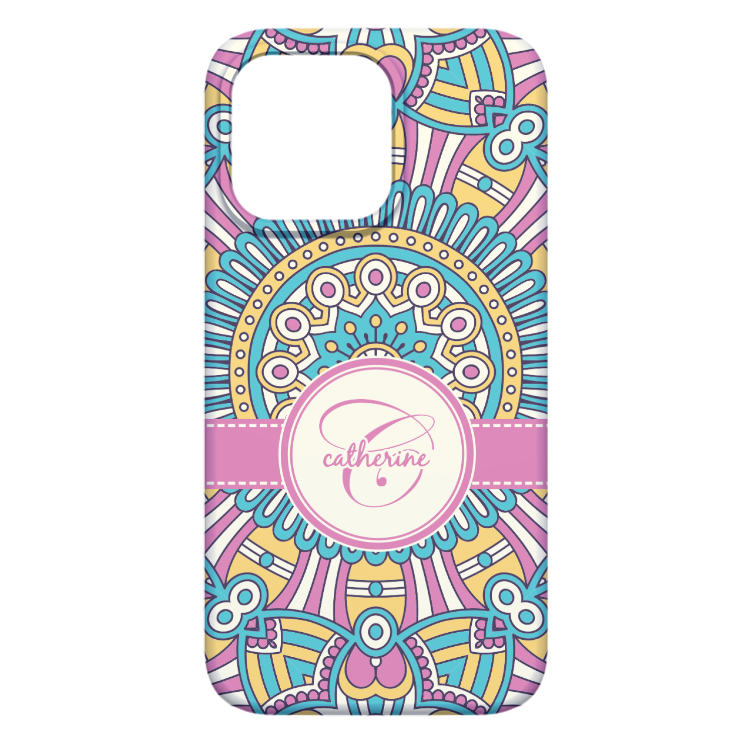 The designs main feature is its beautiful pattern. The pattern is filled with intricate detail and bohemian style shapes. The colors are a drastic difference from what you would normally see in a bohemian design, making this design all the more unique. You are able to put your personalization in the frame in the middle. The colors you will find are a bubble gum pink, teal, light yellow, and white.