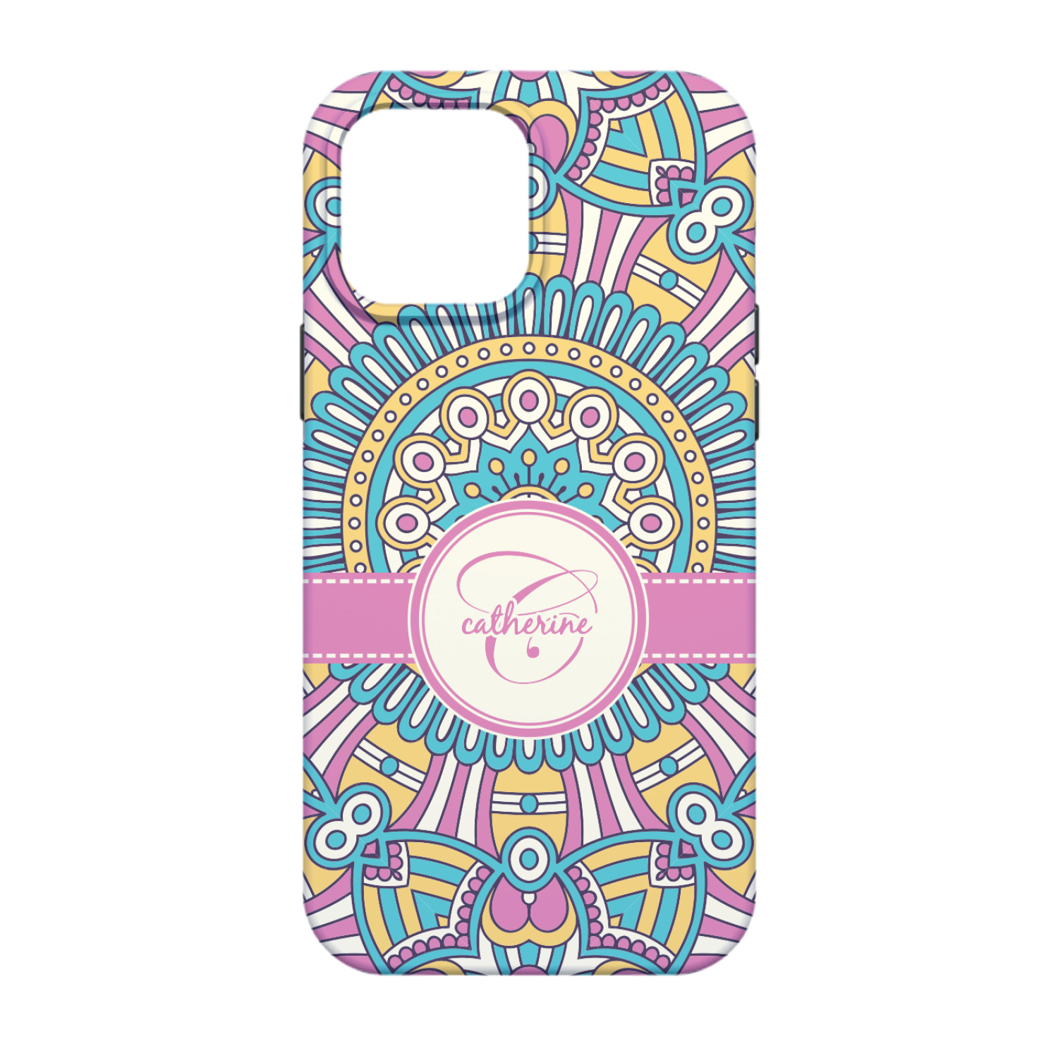 The designs main feature is its beautiful pattern. The pattern is filled with intricate detail and bohemian style shapes. The colors are a drastic difference from what you would normally see in a bohemian design, making this design all the more unique. You are able to put your personalization in the frame in the middle. The colors you will find are a bubble gum pink, teal, light yellow, and white.