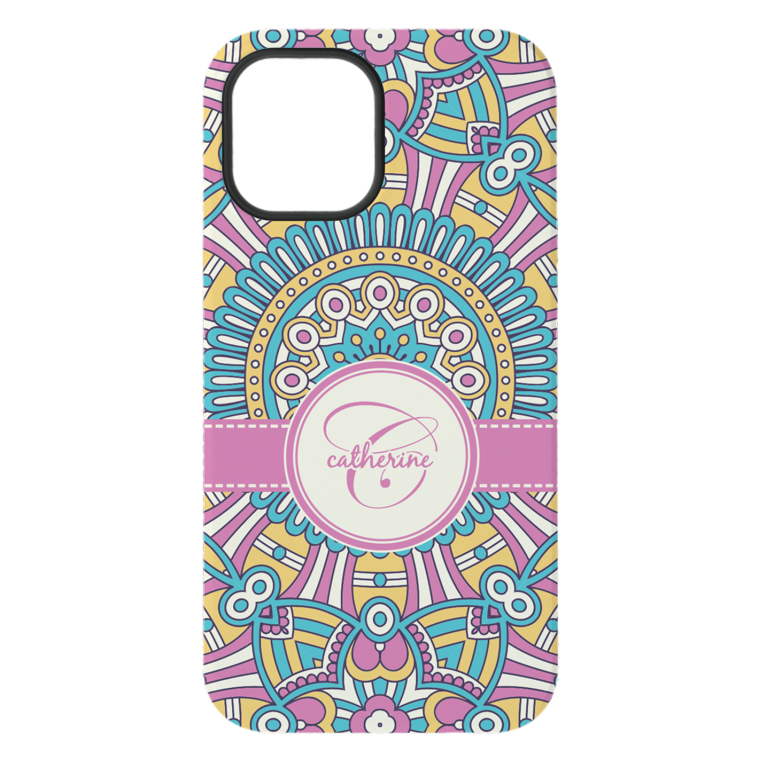 The designs main feature is its beautiful pattern. The pattern is filled with intricate detail and bohemian style shapes. The colors are a drastic difference from what you would normally see in a bohemian design, making this design all the more unique. You are able to put your personalization in the frame in the middle. The colors you will find are a bubble gum pink, teal, light yellow, and white.
