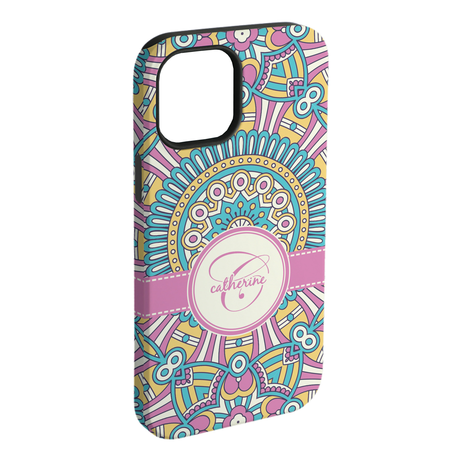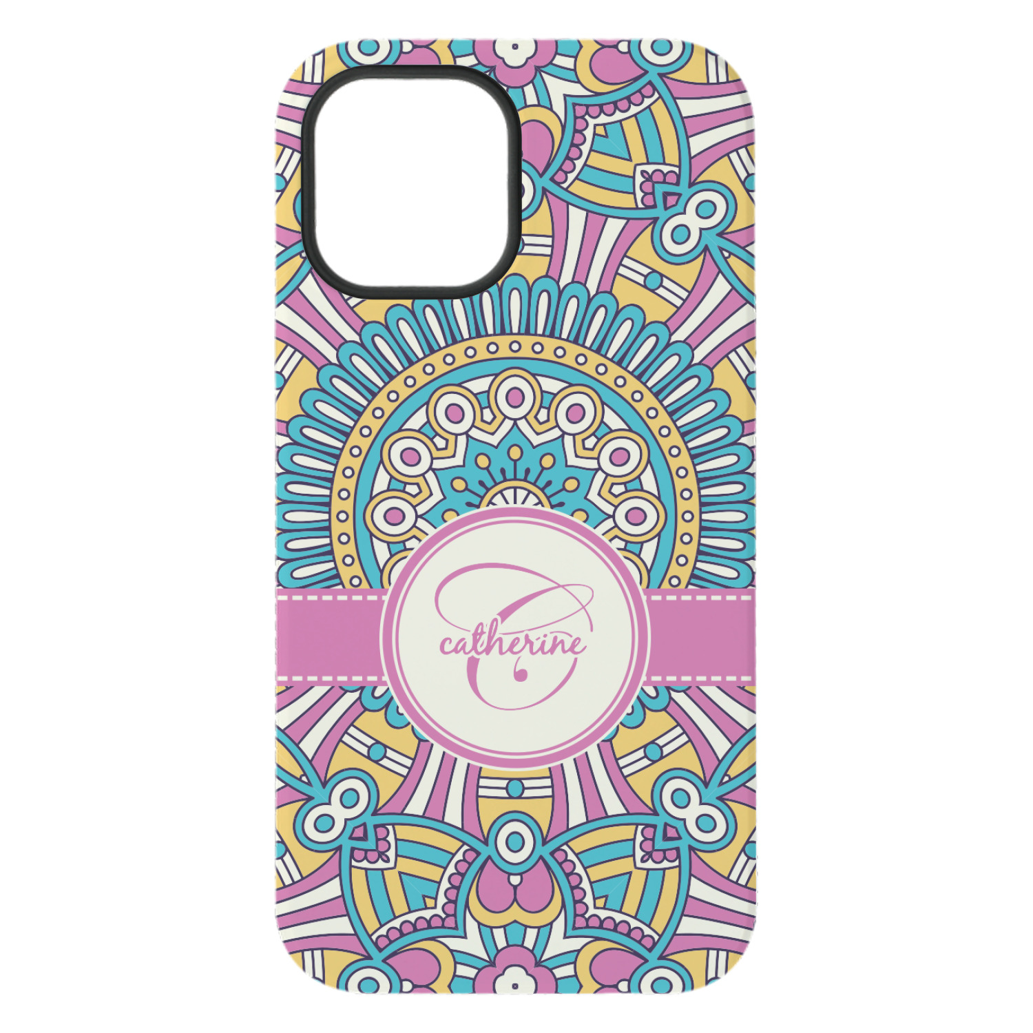 The designs main feature is its beautiful pattern. The pattern is filled with intricate detail and bohemian style shapes. The colors are a drastic difference from what you would normally see in a bohemian design, making this design all the more unique. You are able to put your personalization in the frame in the middle. The colors you will find are a bubble gum pink, teal, light yellow, and white.