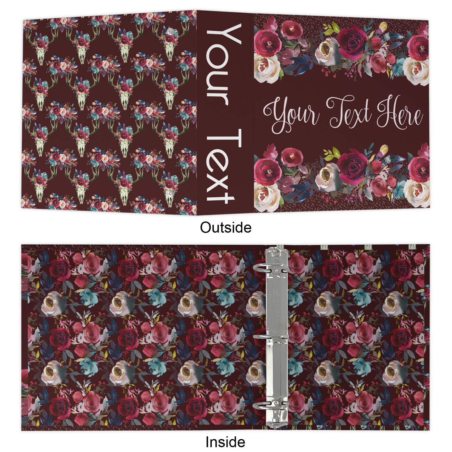 Made from a sturdy cardboard base with a full high quality canvas textured vinyl wrap with the design of your choice. Unlike our standard 3-ring binder with the full wrap design your artwork wraps from the front and back and into the inside of the binder.