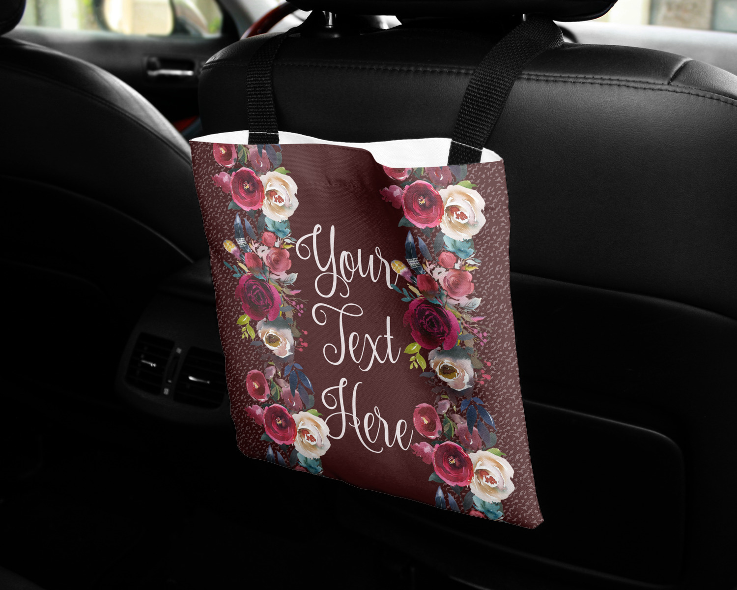 These car back seat organizers are sturdy tote-like bags, fabricated from a robust polyester, and features a single handle on the back side. The strap features an attachable velcro for easy attachment to headrests, grocery carts, car seats, and more. Simply undo the velcro, loop the strap around the headrest, reattach the velcro, and let the organizer hang from the front seat. These car organizers are the perfect means of increasing your backseat's legroom, while storing multiple items in one place for better accessibility. Each car back seat organizer measures at 10 by 10 inches, and features your personalized design printed across its front and back.