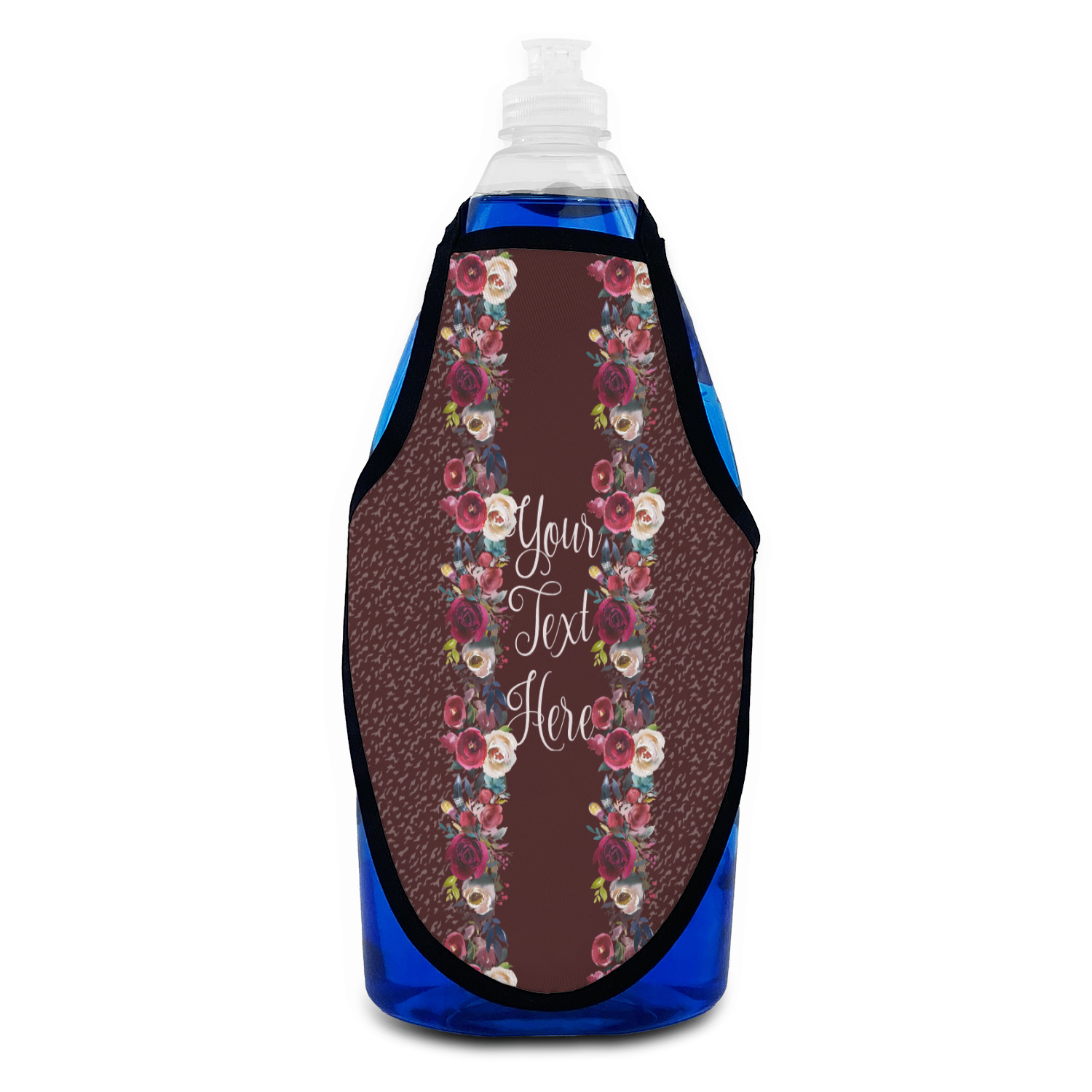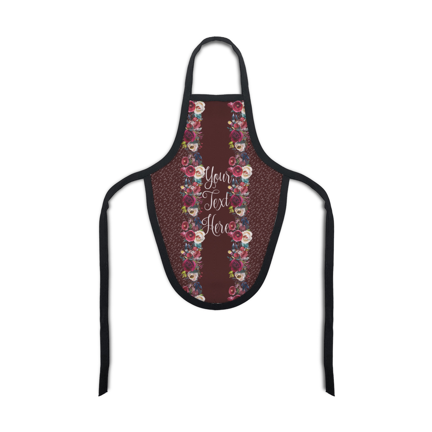 Made from a polyester fabric with black trim and tie string, these bottle aprons fit most large sized bottles including wine bottles, liquor bottles and dish soap bottles. With an included sliding cord lock the neck is adjustable to make these be a universal fit for most any sized bottle. The printed space of the apron measures approximately 8.5" tall and at its widest point the printed area is 6" wide.