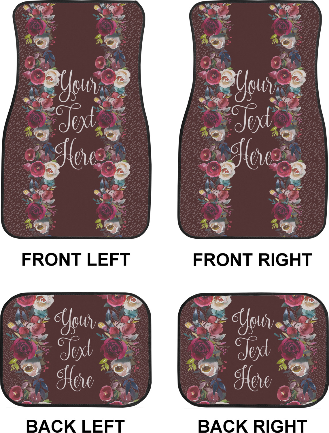We craft our auto floor mats mats from polyester, apply a black finish to the edges, and lined at the bottom to prevent slippage. These mats protect your floors from grass, mud, and any accidental spills. We display your personalized design on the front face of each mat. The sizes of these car floor liners are standardized to provide a versatile fit for all vehicles. The front rows car mats measure at 17 by 26.5 inches, while the back rows measure at 17 by 13 inches. We sell three packages of car floor mats. You can purchase a pair of front row car mats, a pair of back row car mats, or a set of front row and back row car mats. To make an informed purchase, we recommend measuring the surface area of your car floors.