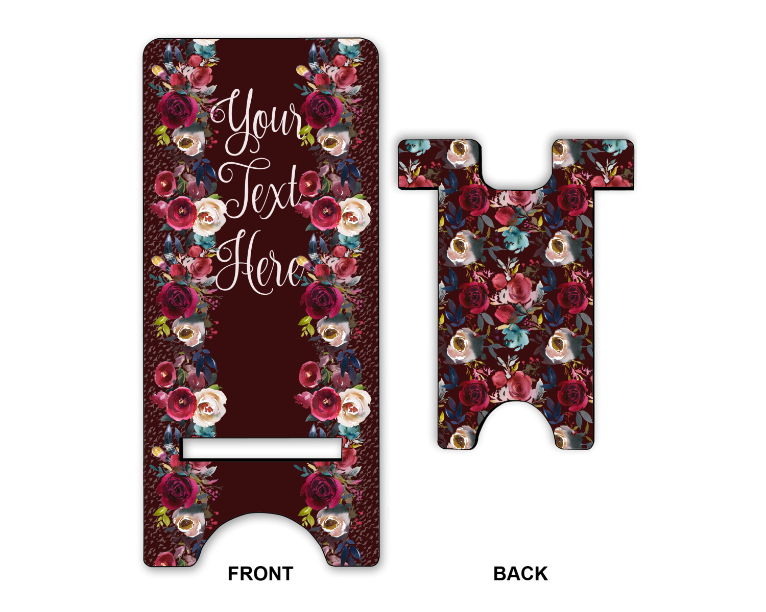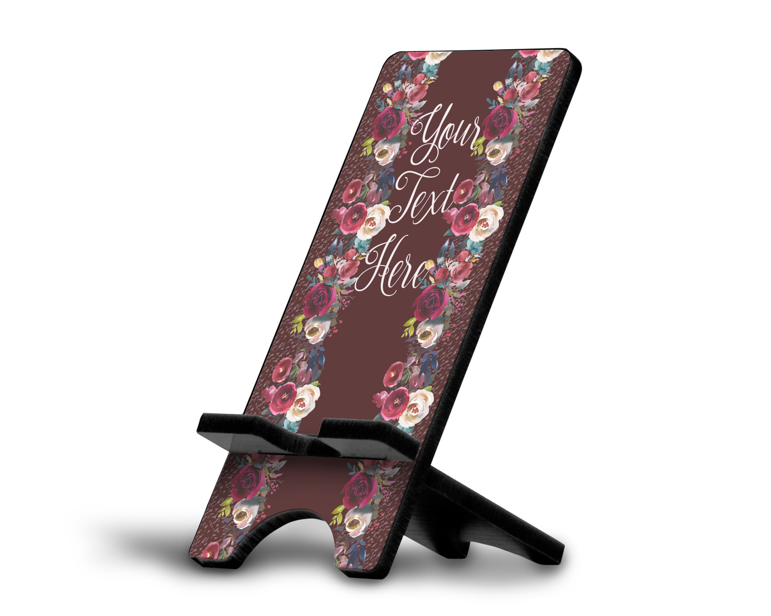 These cell phone holders are comprised of two hardboard pieces, that lock into and steady one another. The bottom part of the mobile phone stand is spacious enough to support both your phone and your charger, while it is not in use. We print your customization atop the face of this stand, while the remaining sides are a sophisticated, black color.