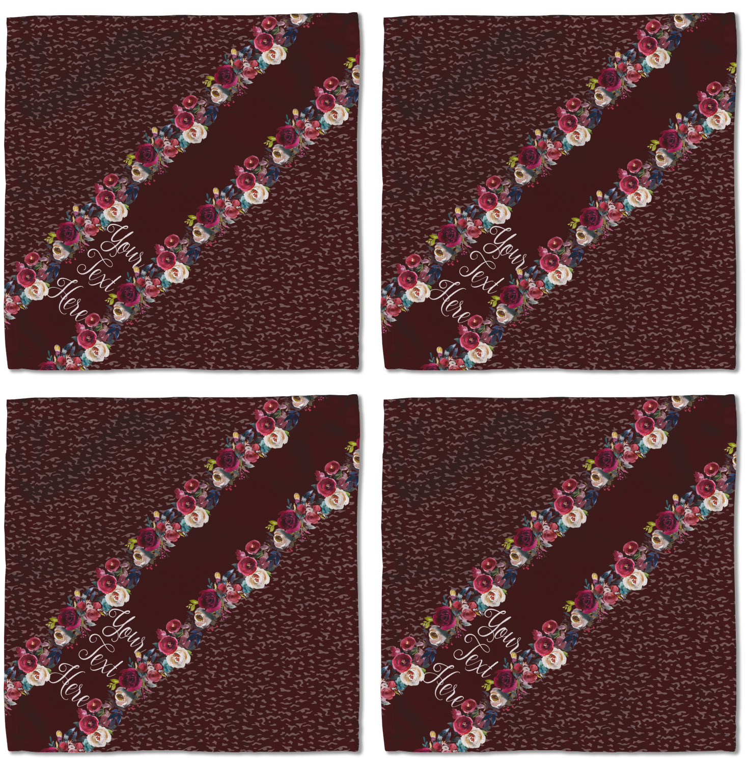 Each customizable cloth napkin is a polyester material guaranteed for long-term use. Since our napkins are cloth, it serves as a great reusable and eco-friendly dining decor. We sell personalized napkins individually or as a set of 4! Print your own unique design on all four napkins, or create four individual designs for each napkin! We offer two different napkin sizes - Cocktail napkins (approx. 10 x 10) and Dinner napkins (approx. 20 x 20). We print your design on one side, perfect for displaying your custom designed lunch napkins in any fold or table setting!