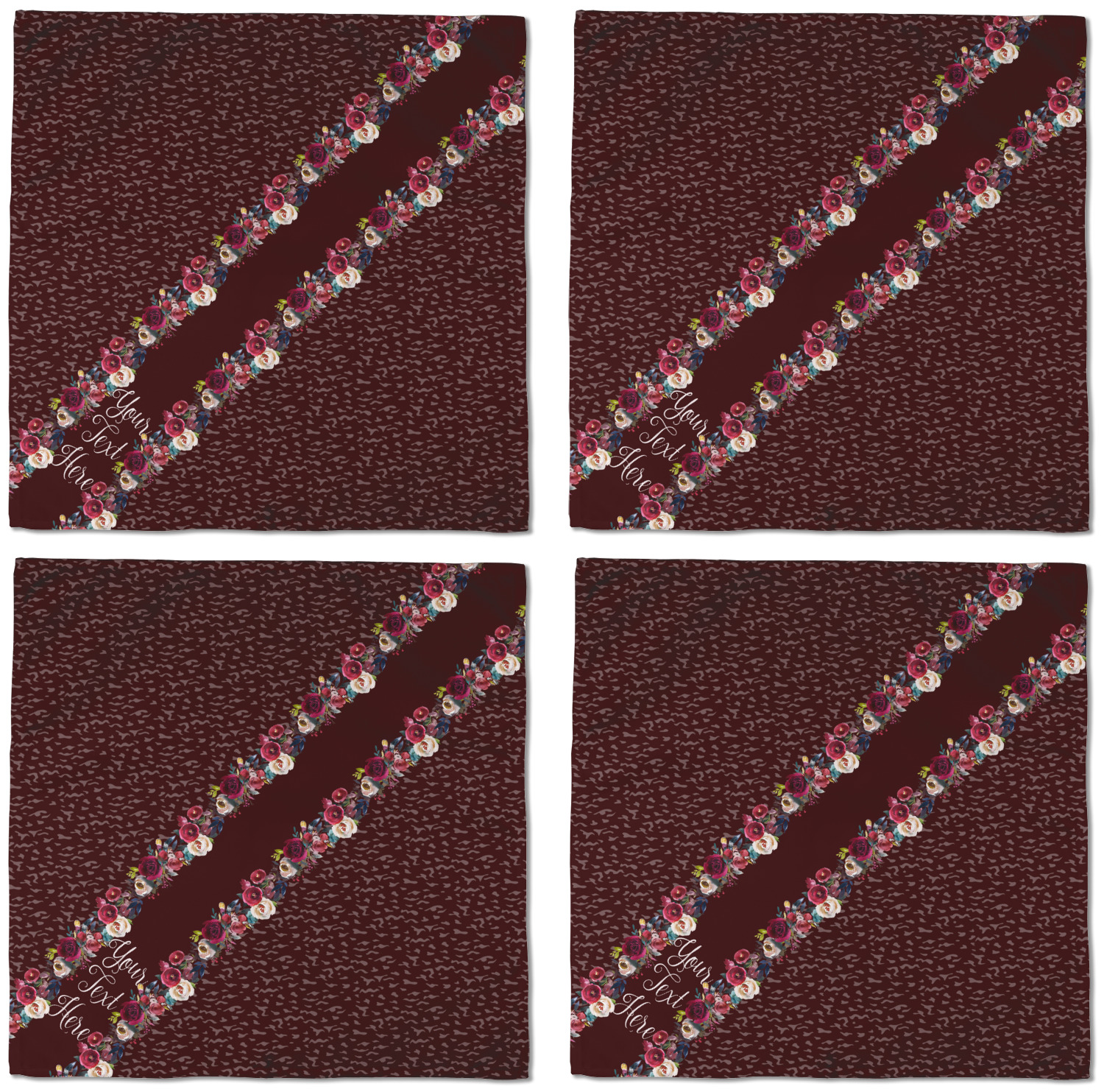 Each customizable cloth napkin is a polyester material guaranteed for long-term use. Since our napkins are cloth, it serves as a great reusable and eco-friendly dining decor. We sell personalized napkins individually or as a set of 4! Print your own unique design on all four napkins, or create four individual designs for each napkin! We offer two different napkin sizes - Cocktail napkins (approx. 10 x 10) and Dinner napkins (approx. 20 x 20). We print your design on one side, perfect for displaying your custom designed lunch napkins in any fold or table setting!