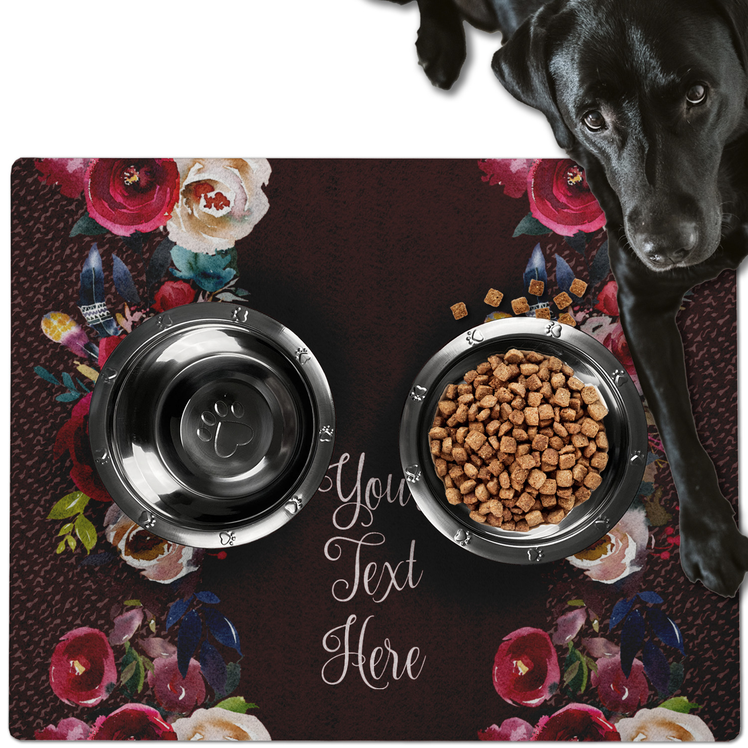 This dog bowl mat, fabricated from polyester, proudly displays your customized design on its top, while its bottom includes a non-slip rubber. This feature allows it to remain firmly in place, even when your dog spills his/her water. With 3 sizes available (18" x 12", 24" x 18", 30" x 24"), the pet food mat has ample space for both a food and water bowl for any sized dogs. Though specified for dogs' use, these mats are also a splendid option for cats.