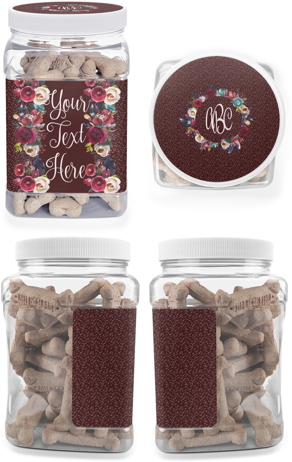 This half gallon jar, made from a sturdy plastic, is the perfect way to keep treats from any naughty pet paws, while still keeping them ready on hand for when your pup performs an impressive trick. This dog cookie jar features a screw-on, white lid that displays your personalized design on a vinyl sticker. We apply another customized sticker that wraps around the front and sides of the jar. Our dog treat jar also has indentations on the rear ends of the sides, which allows for convenient handling, and its square frame allows for easy storage.