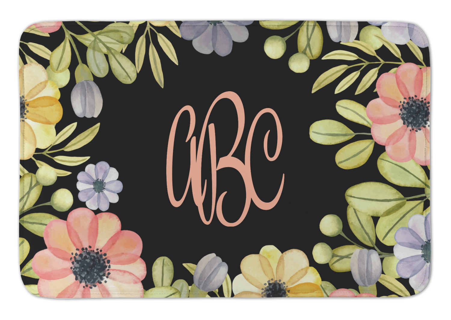 This design features a gorgeous black background with a frame of colorful wild flowers and greenery. You will find pinks, purples, and greens. But, if you were looking for other colors or types of flowers, be sure to take a peek in our design center at the other fun floral frame backgrounds we have. In the middle of this floral design you will find a three letter monogram to give an opportunity for our favorite thing: personalizing!