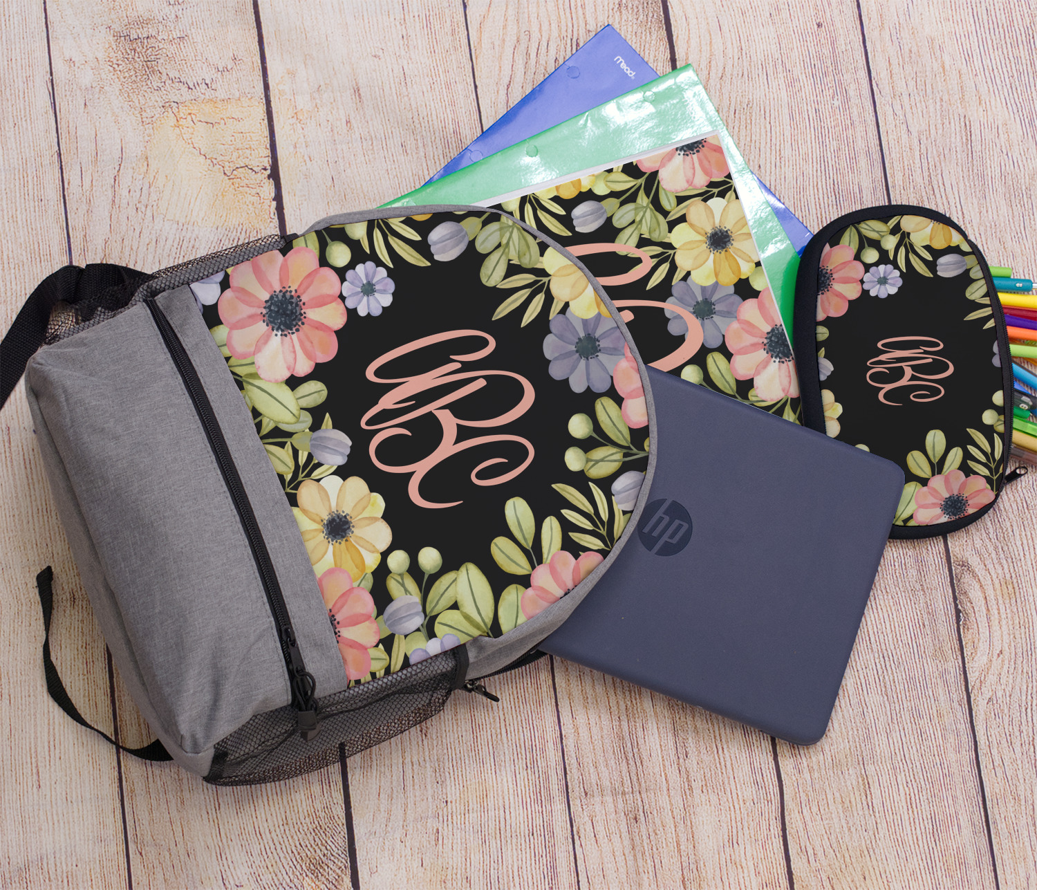 This design features a gorgeous black background with a frame of colorful wild flowers and greenery. You will find pinks, purples, and greens. But, if you were looking for other colors or types of flowers, be sure to take a peek in our design center at the other fun floral frame backgrounds we have. In the middle of this floral design you will find a three letter monogram to give an opportunity for our favorite thing: personalizing!