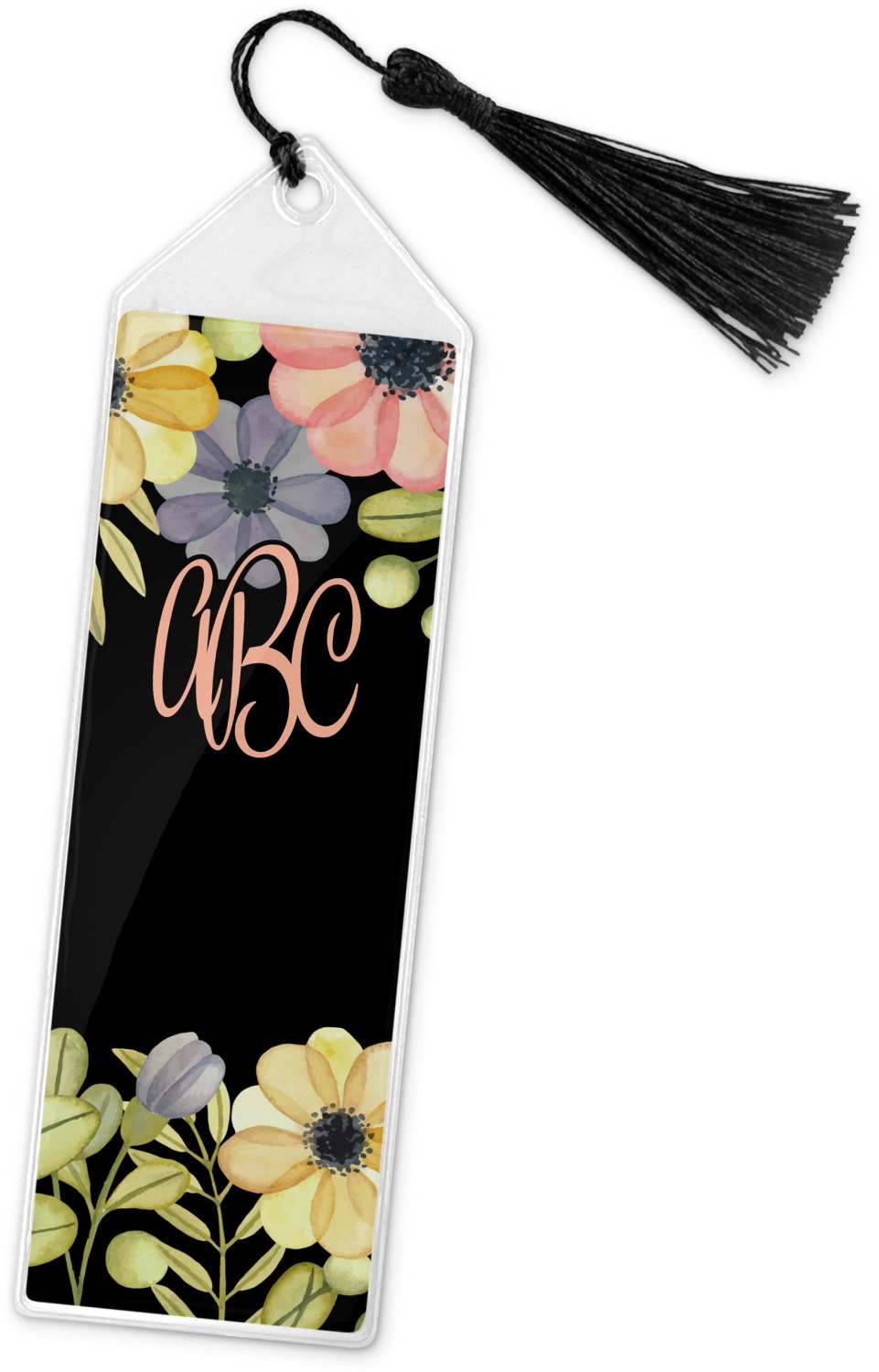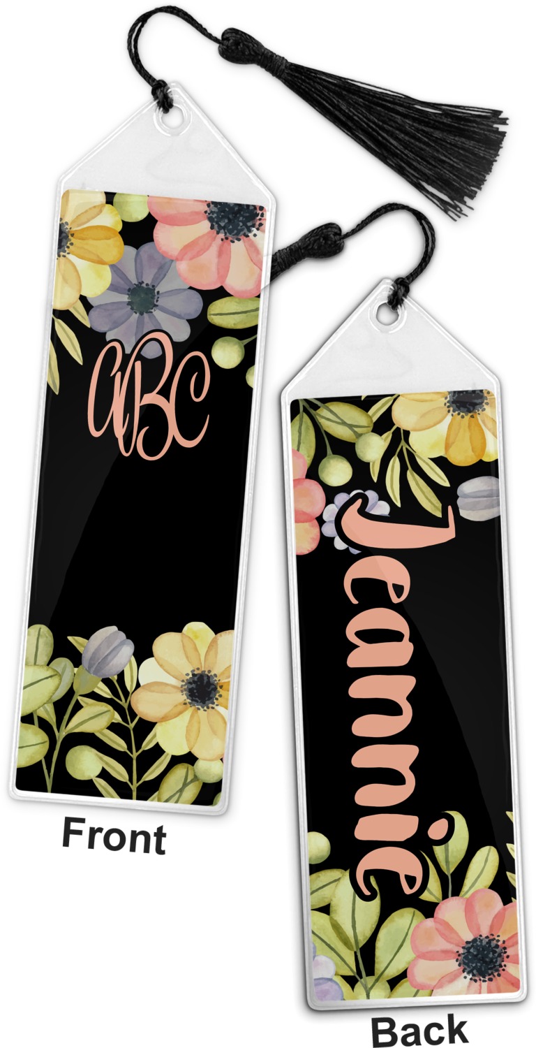 Your personalized bookmark is made of a sturdy, clear vinyl, and is approximately 7.5" x 2.25". We display your personalization on vinyl inserts that are placed on both sides. Accompanying each book marker is a black, fringe tassel that attaches to the reinforced, triangular header.