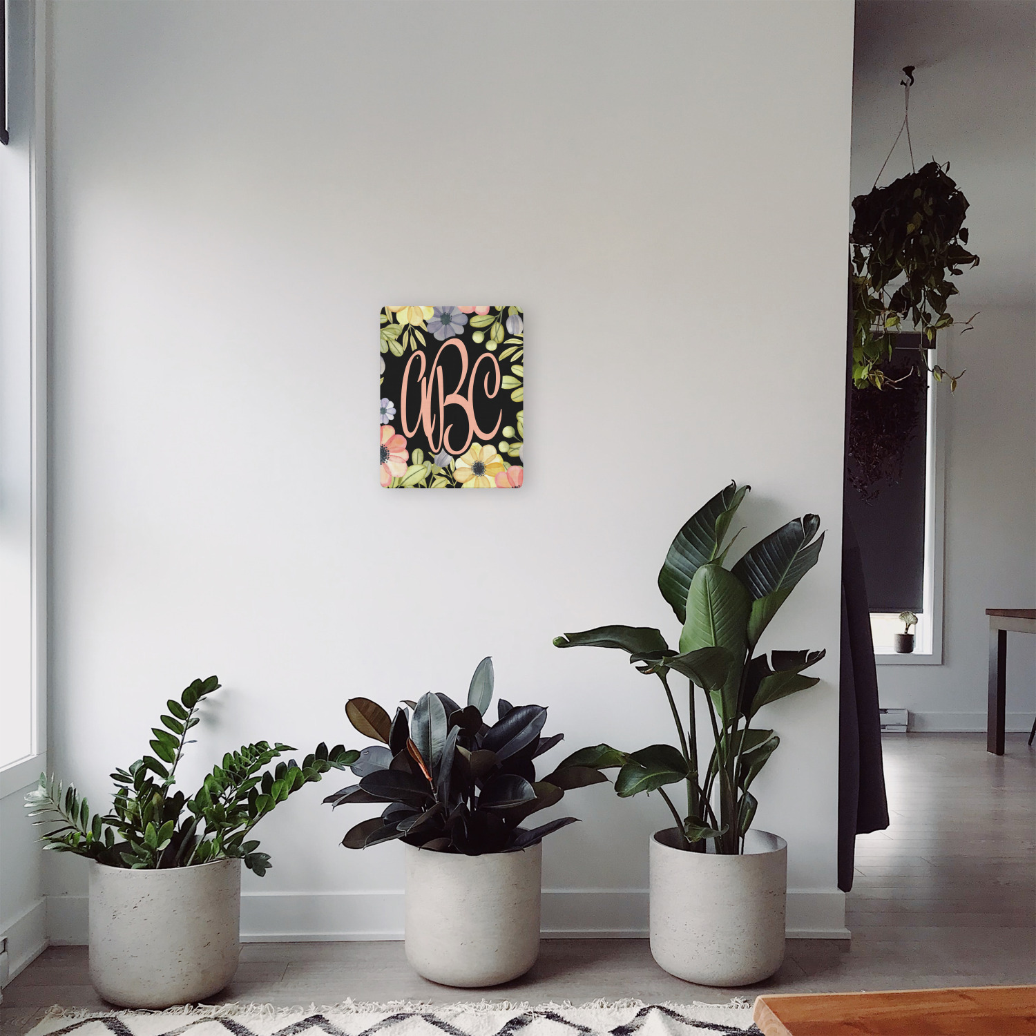 This design features a gorgeous black background with a frame of colorful wild flowers and greenery. You will find pinks, purples, and greens. But, if you were looking for other colors or types of flowers, be sure to take a peek in our design center at the other fun floral frame backgrounds we have. In the middle of this floral design you will find a three letter monogram to give an opportunity for our favorite thing: personalizing!
