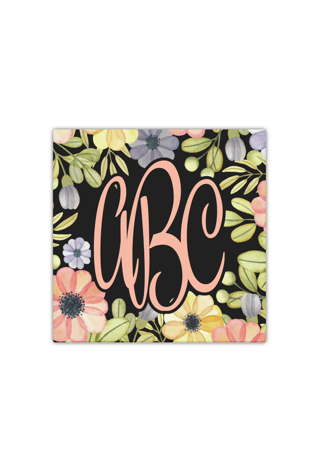 This design features a gorgeous black background with a frame of colorful wild flowers and greenery. You will find pinks, purples, and greens. But, if you were looking for other colors or types of flowers, be sure to take a peek in our design center at the other fun floral frame backgrounds we have. In the middle of this floral design you will find a three letter monogram to give an opportunity for our favorite thing: personalizing!