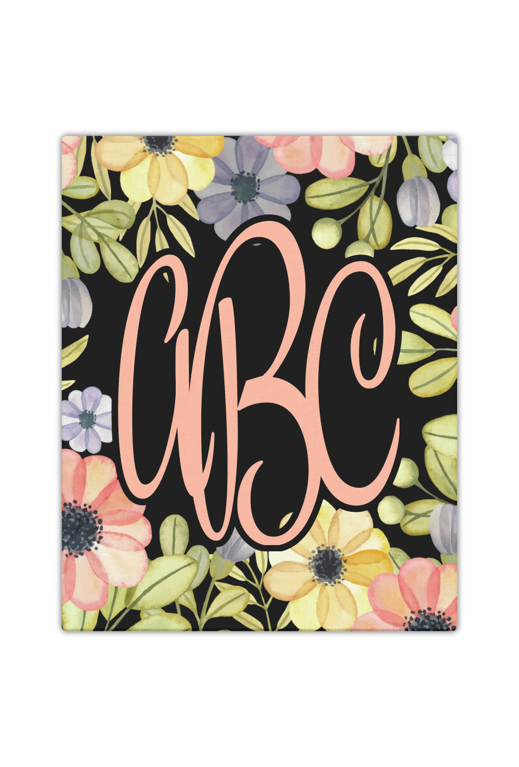 This design features a gorgeous black background with a frame of colorful wild flowers and greenery. You will find pinks, purples, and greens. But, if you were looking for other colors or types of flowers, be sure to take a peek in our design center at the other fun floral frame backgrounds we have. In the middle of this floral design you will find a three letter monogram to give an opportunity for our favorite thing: personalizing!