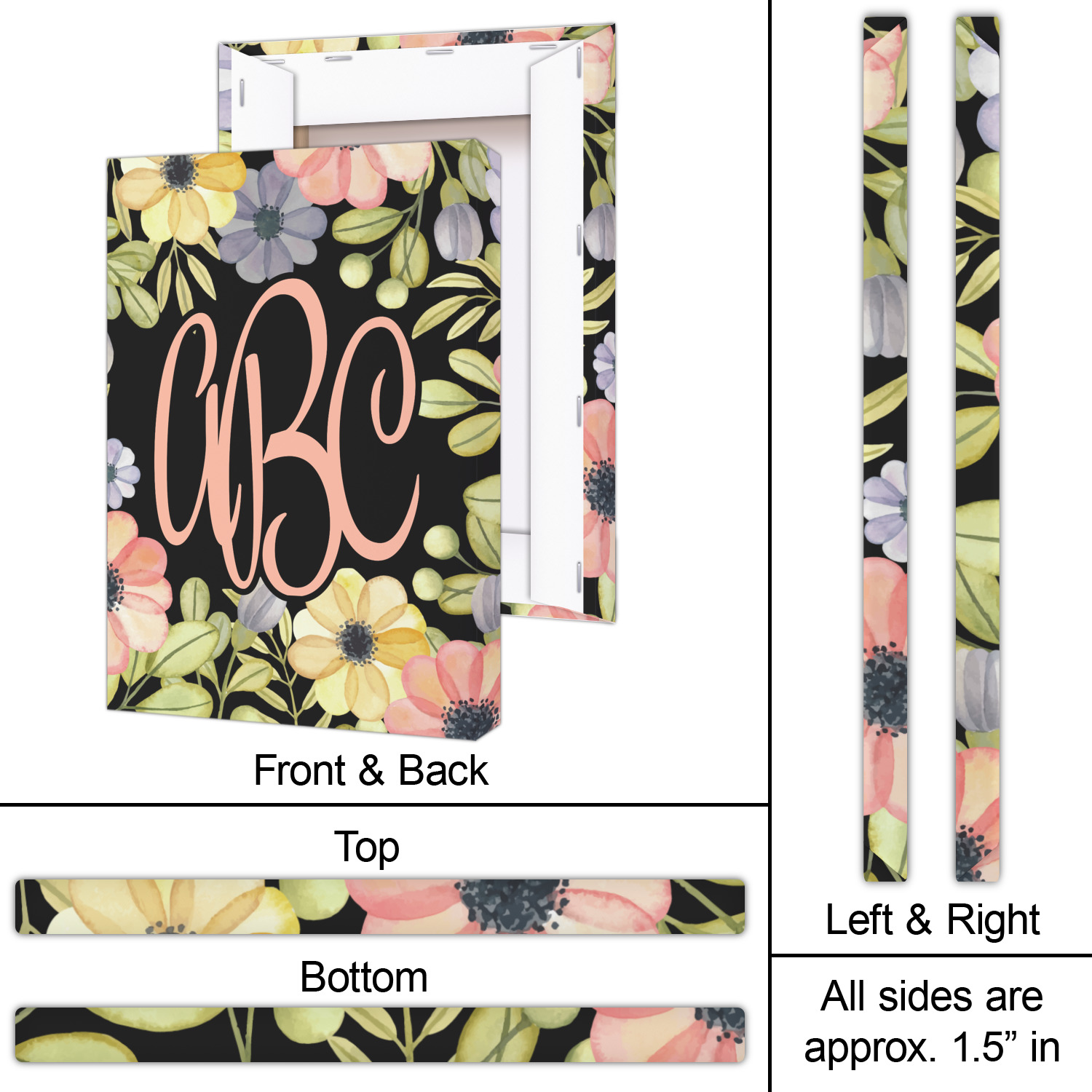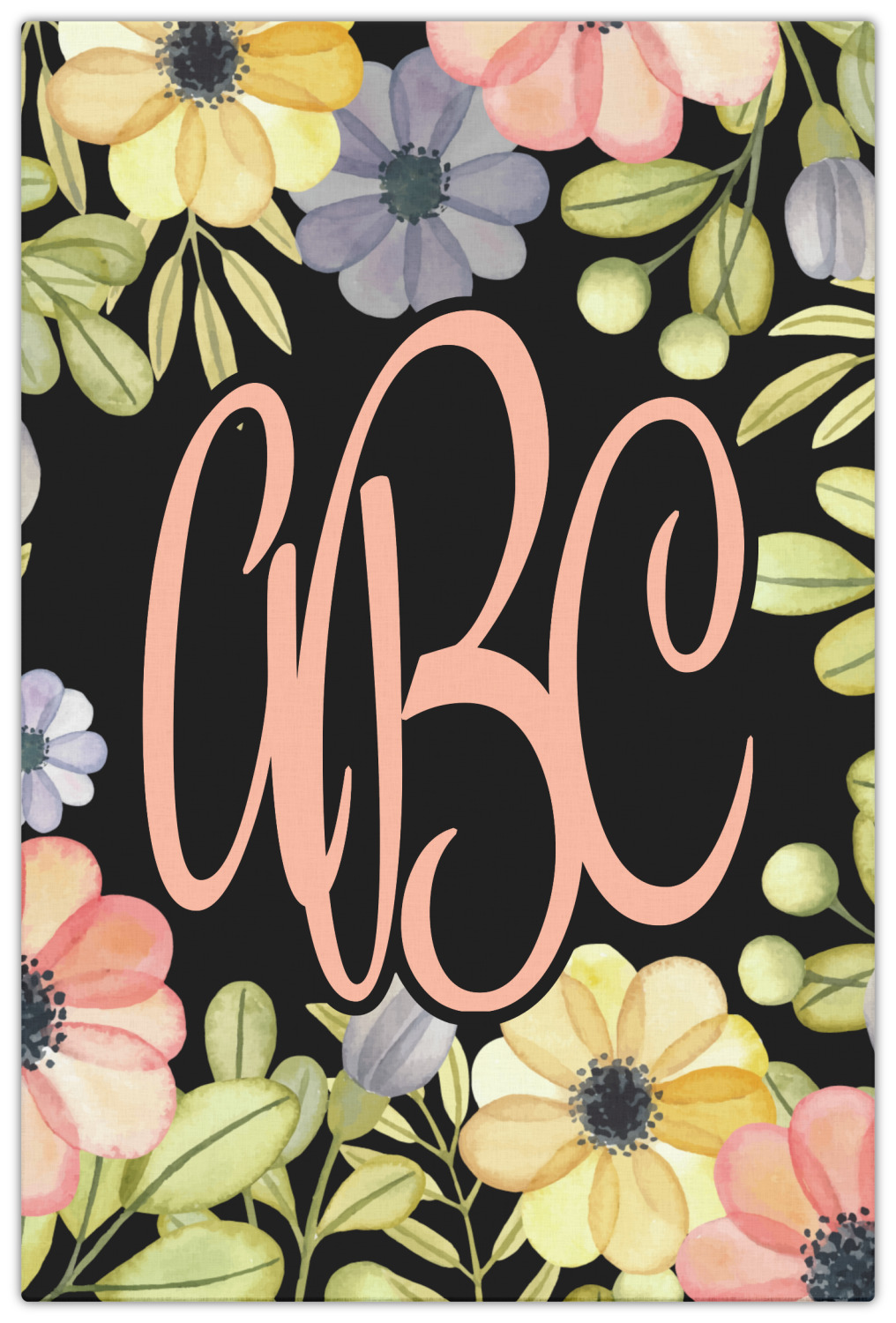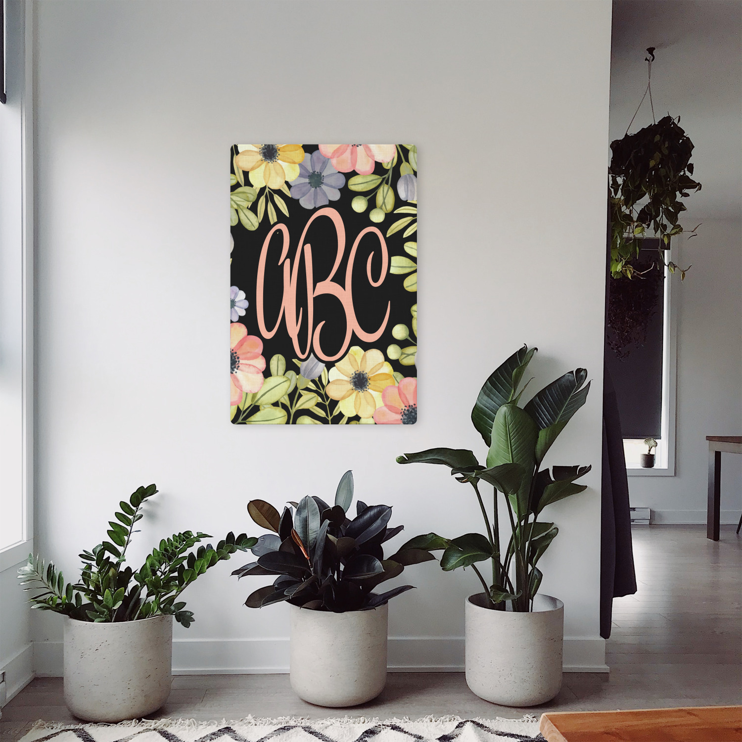 This design features a gorgeous black background with a frame of colorful wild flowers and greenery. You will find pinks, purples, and greens. But, if you were looking for other colors or types of flowers, be sure to take a peek in our design center at the other fun floral frame backgrounds we have. In the middle of this floral design you will find a three letter monogram to give an opportunity for our favorite thing: personalizing!