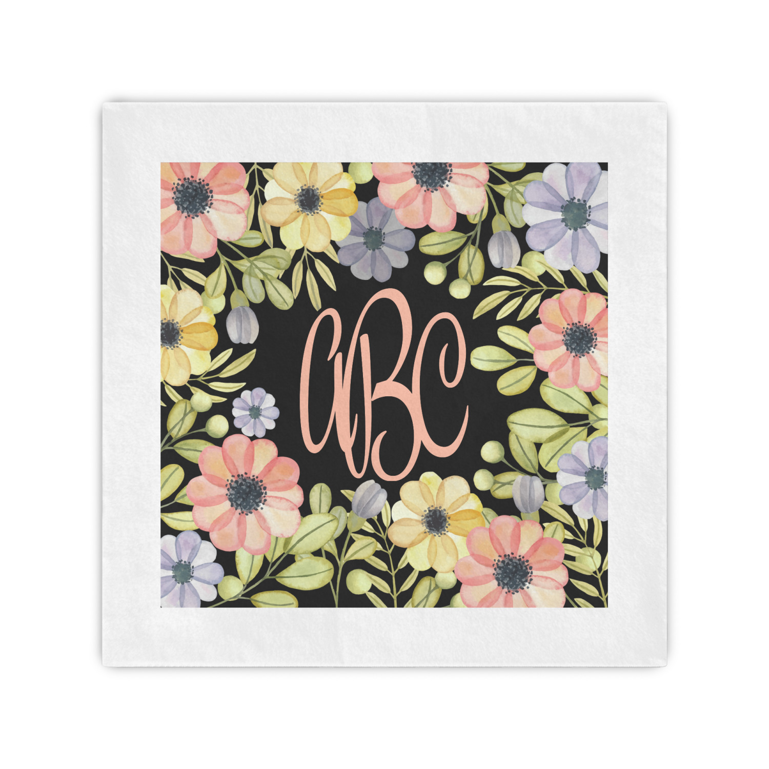This design features a gorgeous black background with a frame of colorful wild flowers and greenery. You will find pinks, purples, and greens. But, if you were looking for other colors or types of flowers, be sure to take a peek in our design center at the other fun floral frame backgrounds we have. In the middle of this floral design you will find a three letter monogram to give an opportunity for our favorite thing: personalizing!