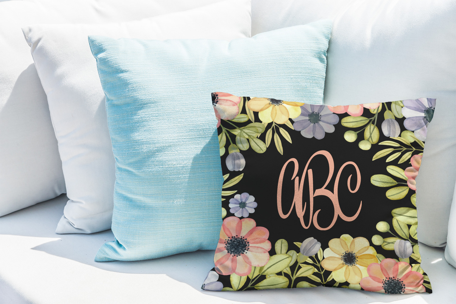 This design features a gorgeous black background with a frame of colorful wild flowers and greenery. You will find pinks, purples, and greens. But, if you were looking for other colors or types of flowers, be sure to take a peek in our design center at the other fun floral frame backgrounds we have. In the middle of this floral design you will find a three letter monogram to give an opportunity for our favorite thing: personalizing!