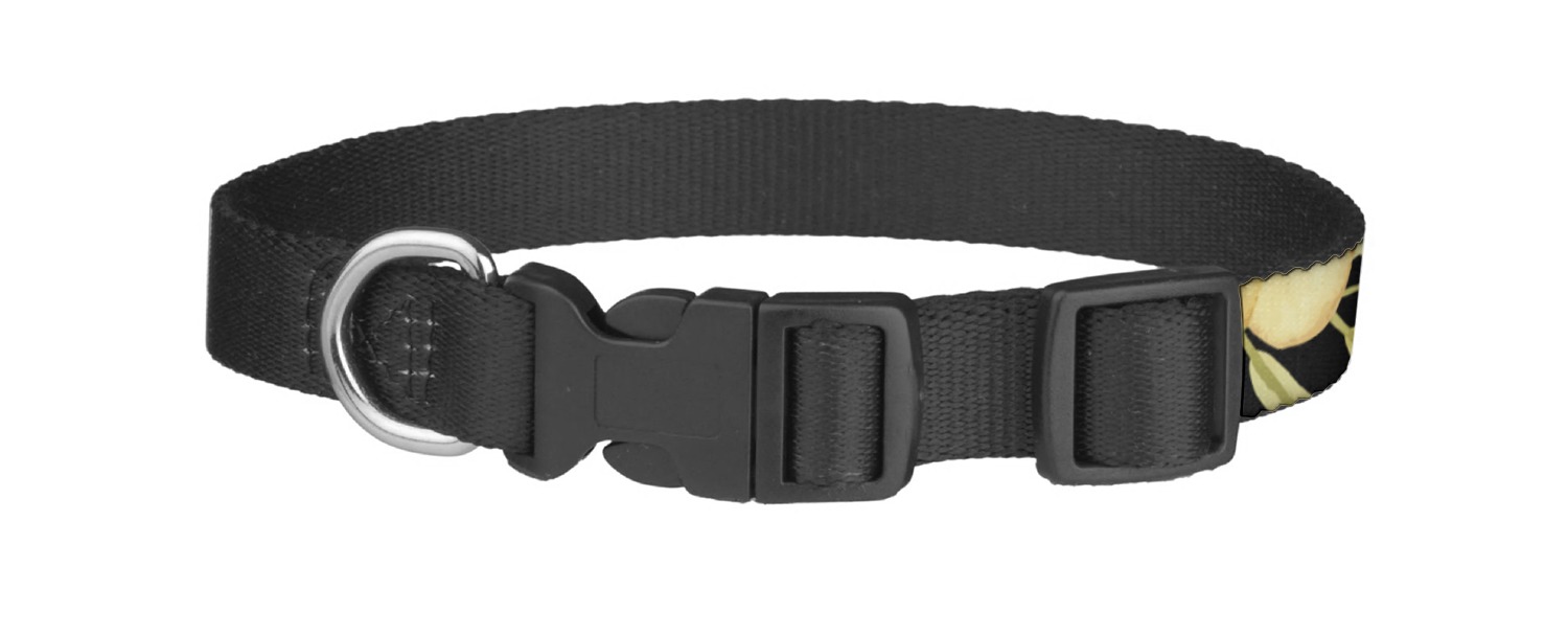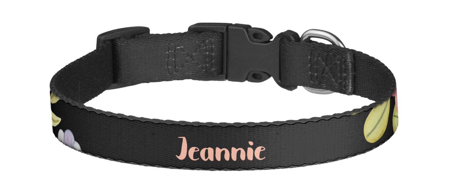 This sturdy collar, made from a durable nylon weave, will outlive your dog's episodes of excited tugging and pulling. Courtesy of its thick plastic buckle and adjuster, this collar is adjustable and accommodating of any dog. Structurally, the collar is a single piece of nylon weave that is sewn together, and features a solid metal loop where you can attach a leash or dog tag. We print and display your dog's name and pattern across the middle of the personalized dog collar.