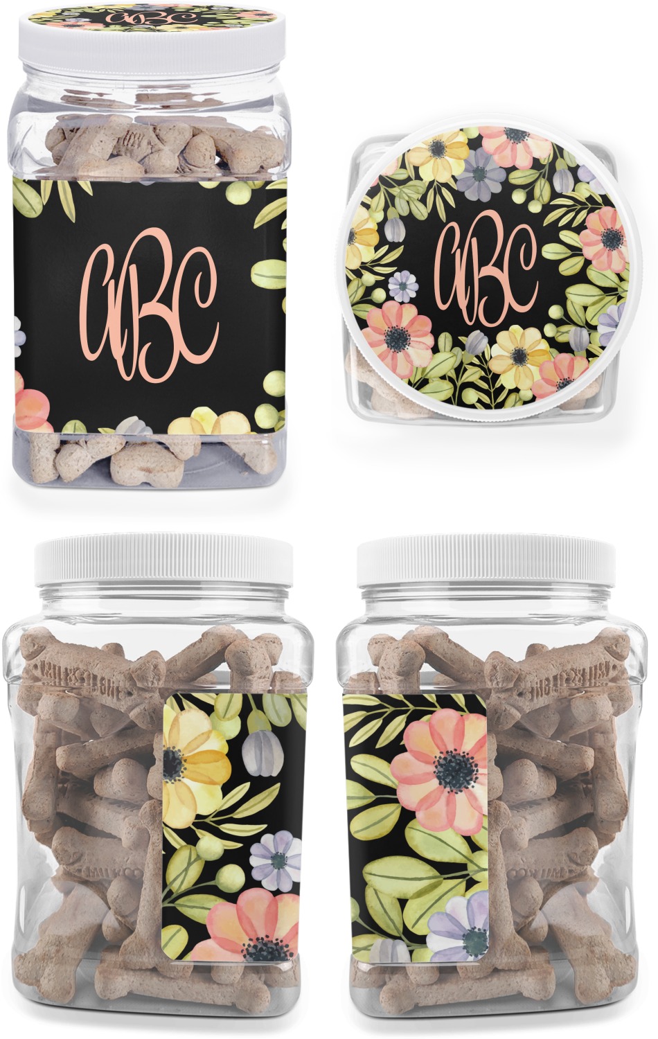 This half gallon jar, made from a sturdy plastic, is the perfect way to keep treats from any naughty pet paws, while still keeping them ready on hand for when your pup performs an impressive trick. This dog cookie jar features a screw-on, white lid that displays your personalized design on a vinyl sticker. We apply another customized sticker that wraps around the front and sides of the jar. Our dog treat jar also has indentations on the rear ends of the sides, which allows for convenient handling, and its square frame allows for easy storage.