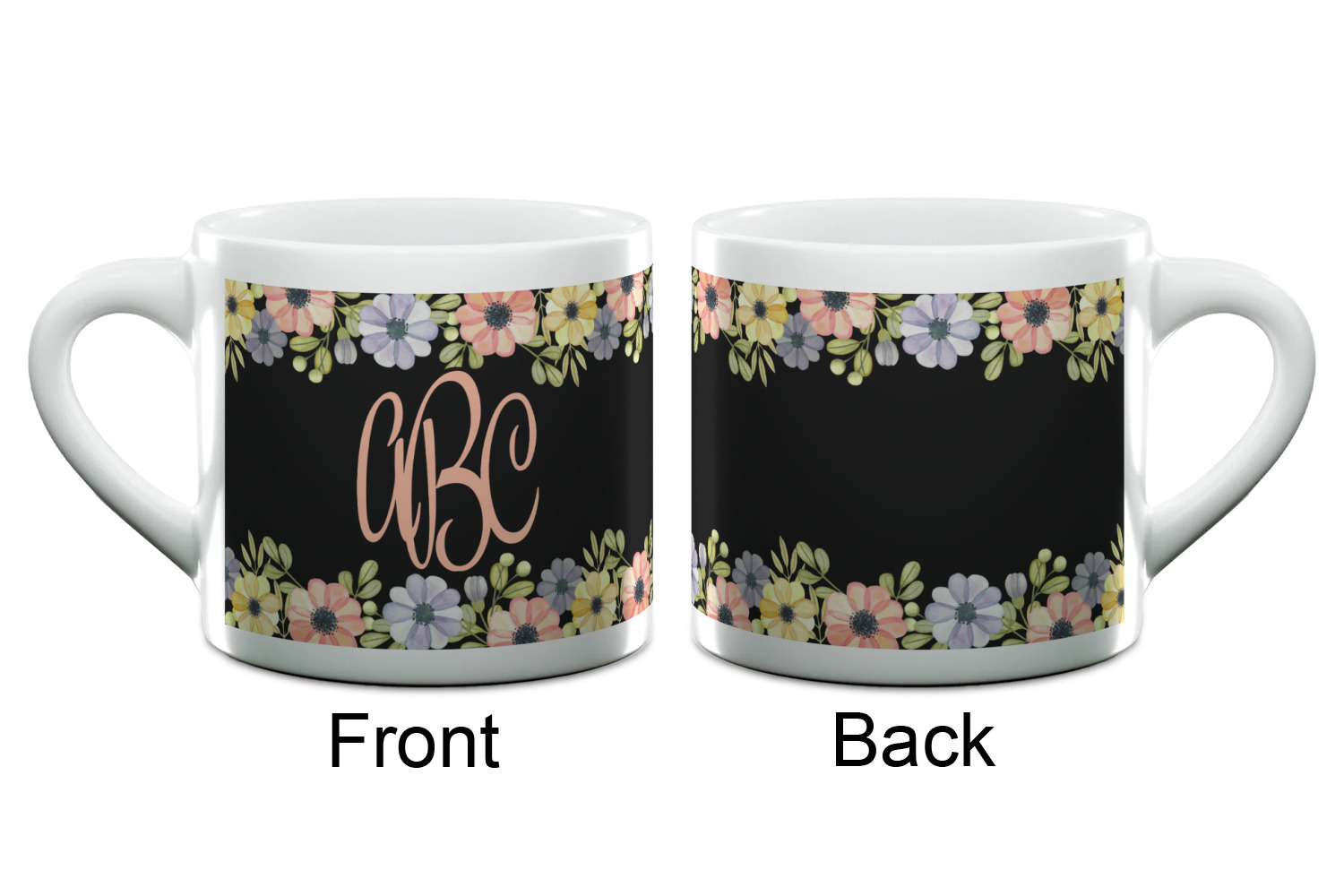 Each of our espresso mugs is a ceramic material sure to keep your drink warm. Personalize one cup for yourself, or order a set of 4! Its the perfect little gift for any coffee lover! We carry two sizes for you to personalize - 3 oz. (approx. 3.25" x 2.325" x 2.625") or 6 oz. (approx. 4" x 2.9" x 2.9"). Our 3 oz. mug is perfect for that single shot espresso while our 6 oz. mug can be your next favorite cappuccino cup holding two shots of espresso!