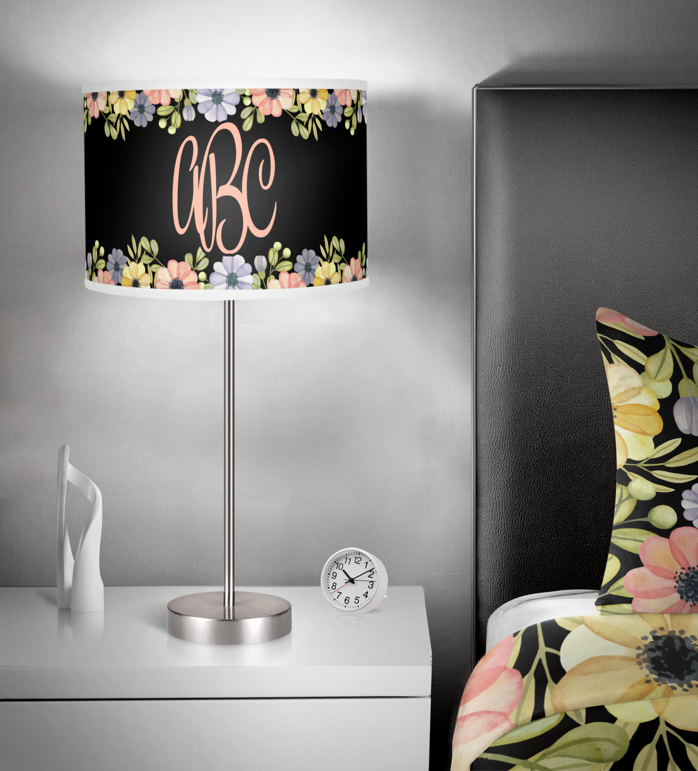 This design features a gorgeous black background with a frame of colorful wild flowers and greenery. You will find pinks, purples, and greens. But, if you were looking for other colors or types of flowers, be sure to take a peek in our design center at the other fun floral frame backgrounds we have. In the middle of this floral design you will find a three letter monogram to give an opportunity for our favorite thing: personalizing!
