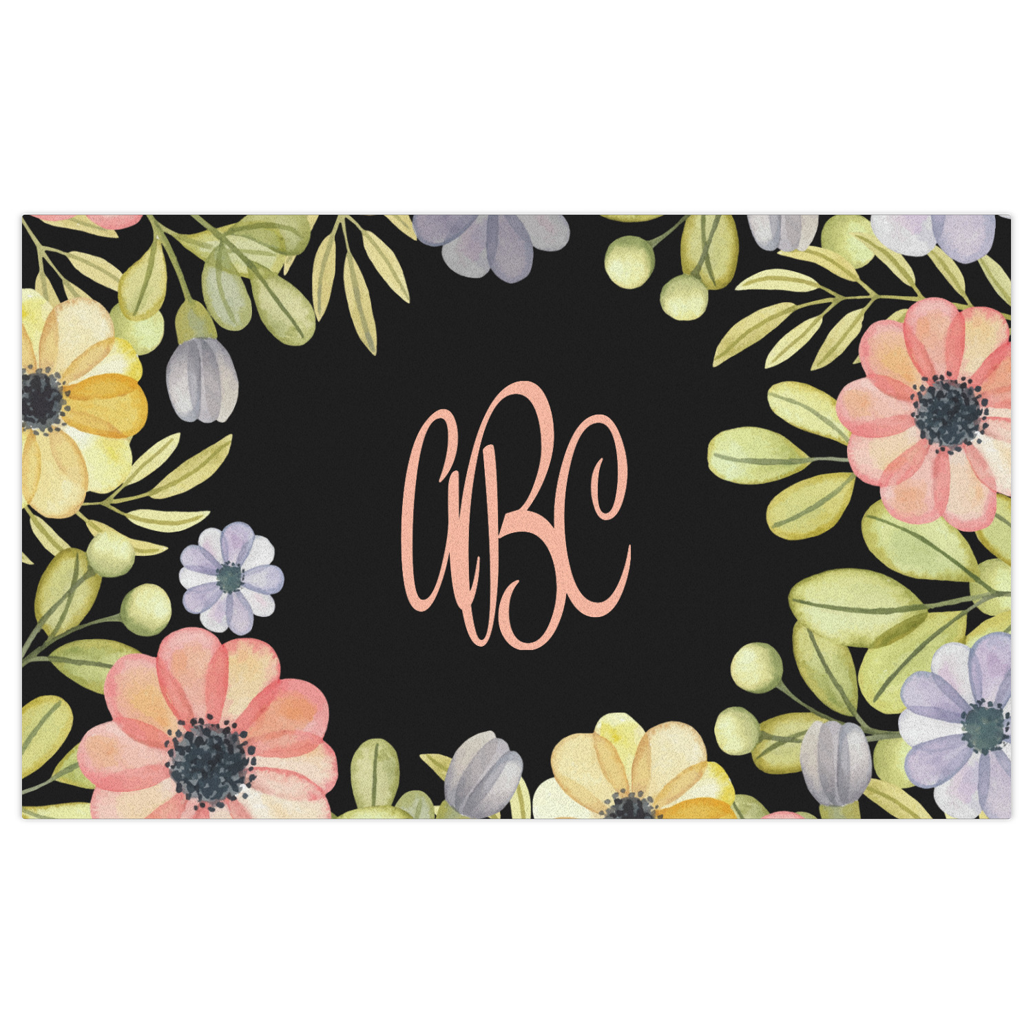 This design features a gorgeous black background with a frame of colorful wild flowers and greenery. You will find pinks, purples, and greens. But, if you were looking for other colors or types of flowers, be sure to take a peek in our design center at the other fun floral frame backgrounds we have. In the middle of this floral design you will find a three letter monogram to give an opportunity for our favorite thing: personalizing!