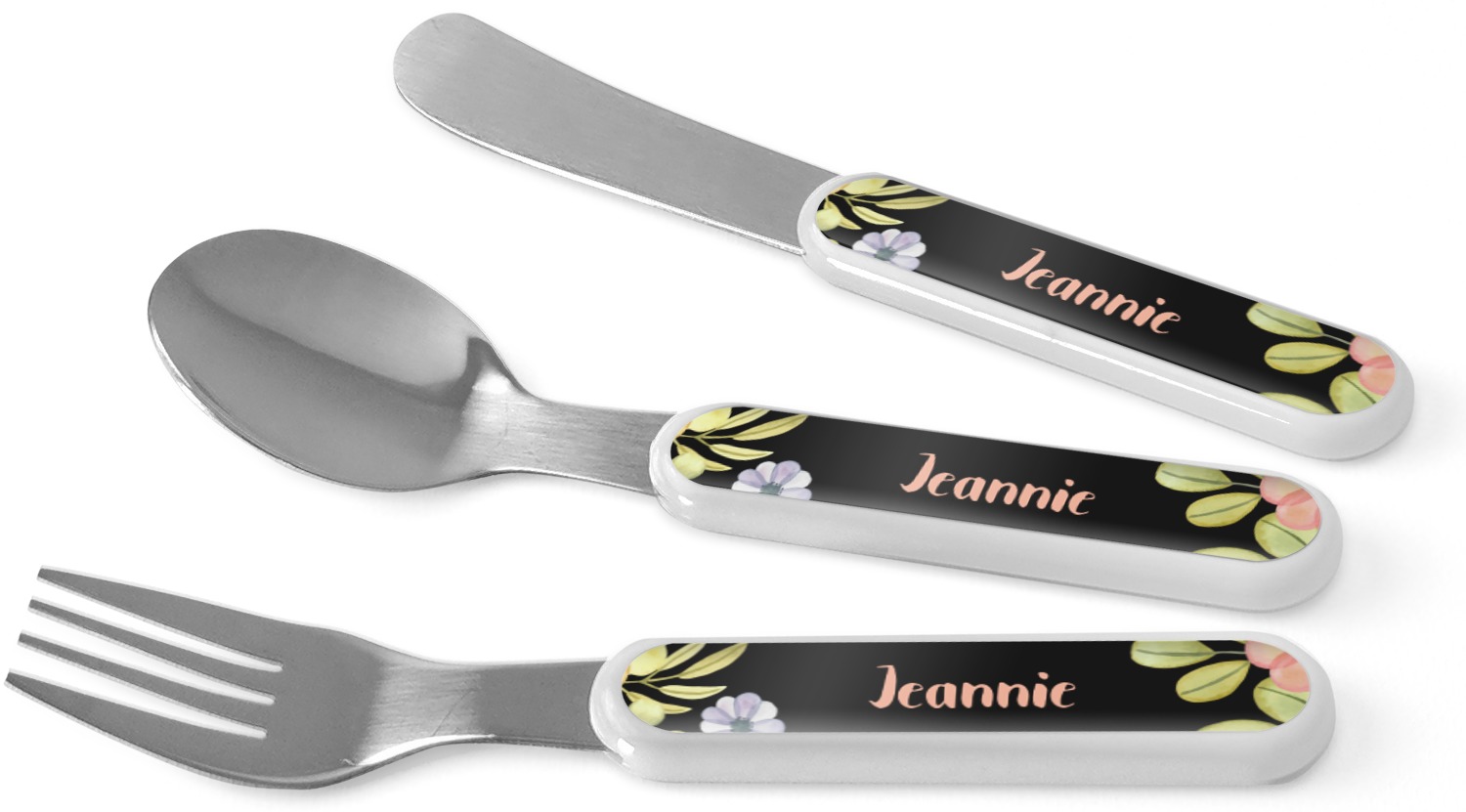 This set of kids' silverware includes a 5.5 inch spoon, fork, and knife, catered to your little one's needs. The prongs of this fork are flat and dull, while our spoon is small enough for tiny mouths, and the dullness of the knife itself resembles a butter knife, at most. These kids' utensils are made of stainless steel, while the handles are crafted from a durable plastic that will withstand the energy and use of your young one. We print your customization across the handles, making the cutlery set unique to your child only.