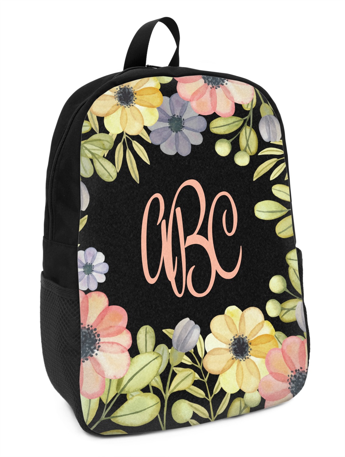 These small backpacks are made of a durable black canvas material with your personalization right on the front. The two shoulder straps are padded and easily adjustable. The bag itself measures at about 11" W x 15" H x 5" D. It's the perfect size for elementary aged kids or adults who want a smaller backpack. On the top of the bag you will find a handle to hang or carry your backpack by as well as a large zipper closure to keep all of your belongings safe inside. On each side of your backpack is a mesh pocket for a small item or water bottle. Inside your backpack you will find a spacious area with a small zipper pocket and a padded laptop slot that will fit up to a 13" laptop (13" being very snug). This is the perfect bag for any student that needs a couple books and their laptop with them at all times. It also works great as a carry on for traveling!
