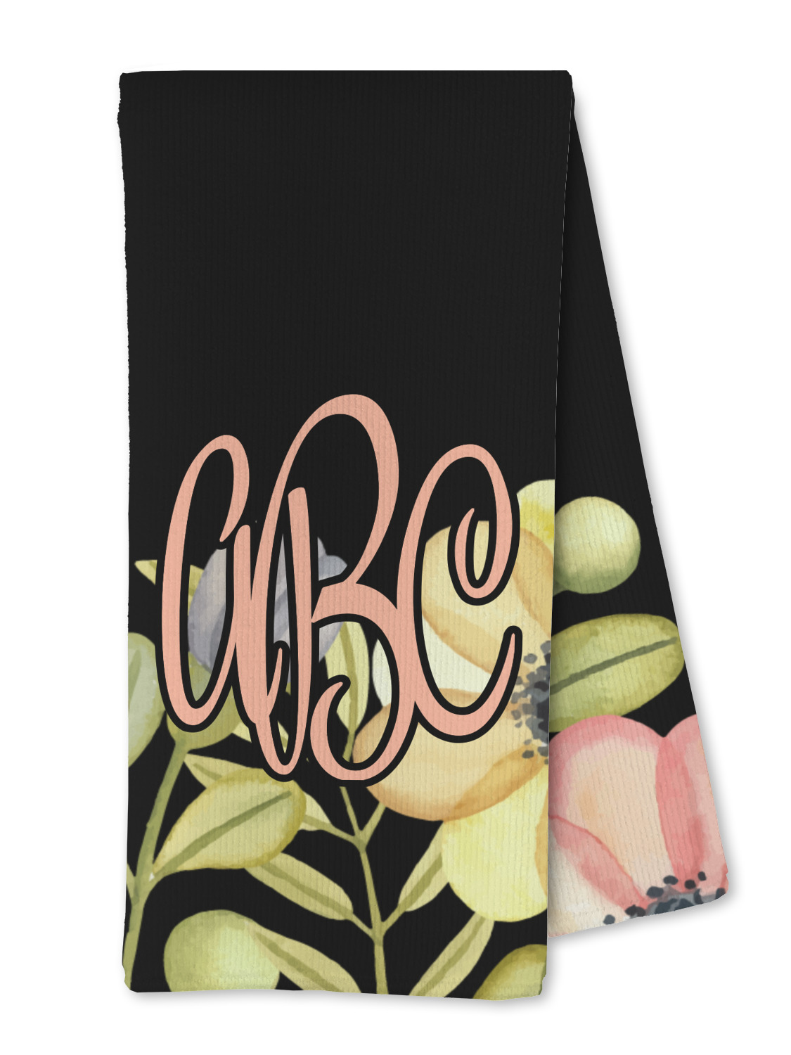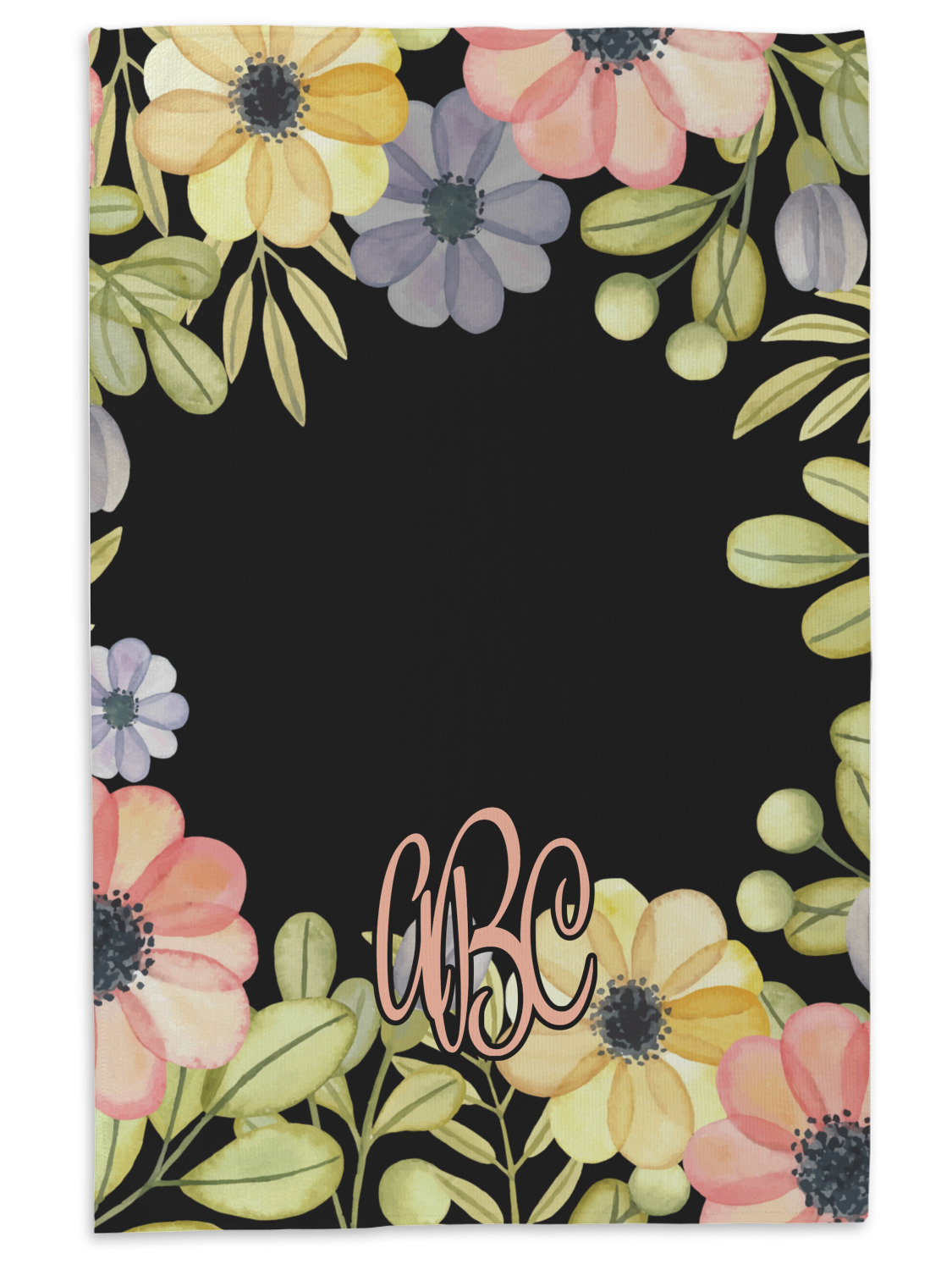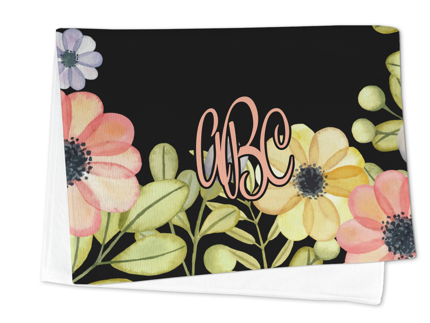 This design features a gorgeous black background with a frame of colorful wild flowers and greenery. You will find pinks, purples, and greens. But, if you were looking for other colors or types of flowers, be sure to take a peek in our design center at the other fun floral frame backgrounds we have. In the middle of this floral design you will find a three letter monogram to give an opportunity for our favorite thing: personalizing!