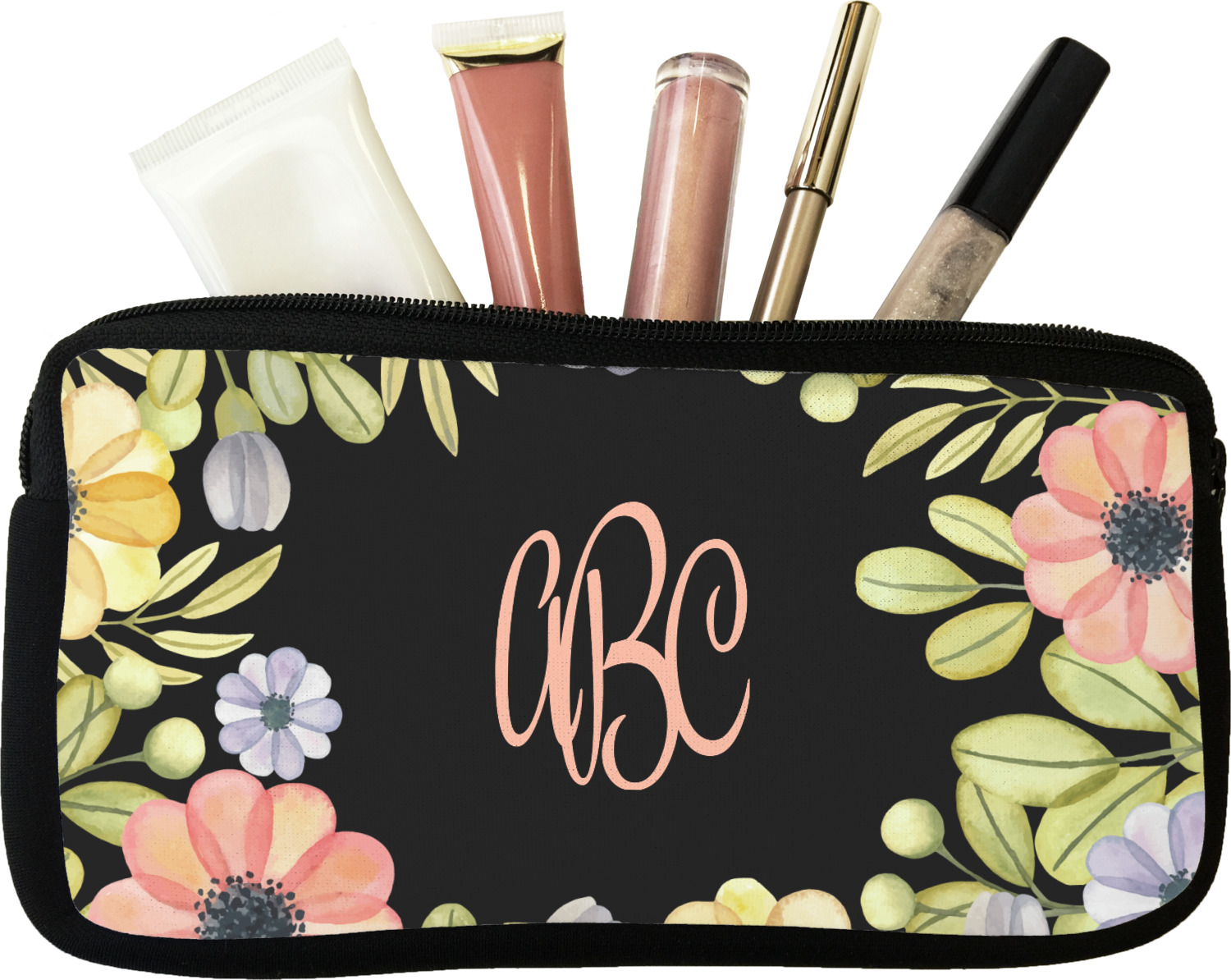 Our personalized makeup bags are available in many different designs, patterns and colors - so you are sure to find one that will love. They are made of neoprene (same material as wet-suits) and thus are water resistant, so spillages in your makeup bag will not end up all over you purse. They are customized on one side and are black on the other side and the zipper is black as well.