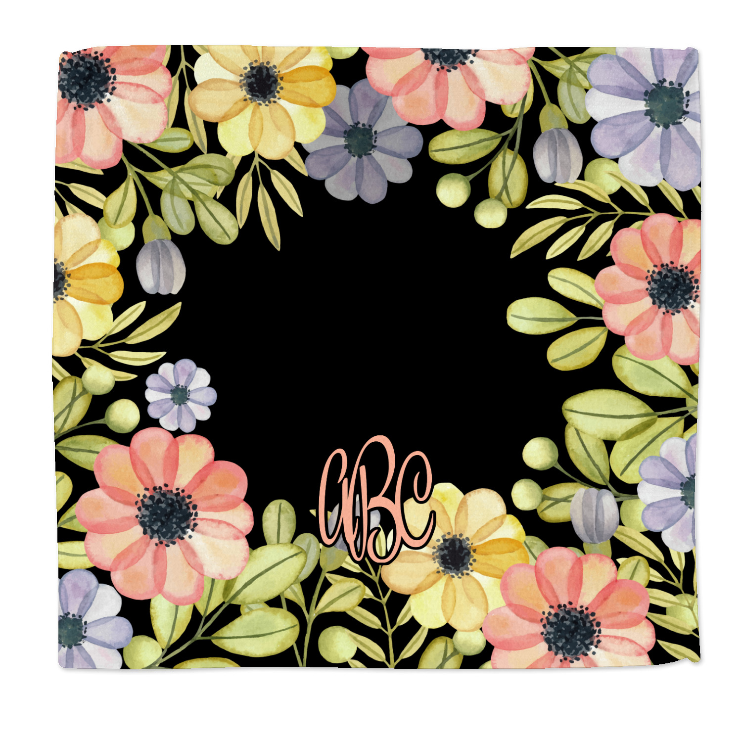 This design features a gorgeous black background with a frame of colorful wild flowers and greenery. You will find pinks, purples, and greens. But, if you were looking for other colors or types of flowers, be sure to take a peek in our design center at the other fun floral frame backgrounds we have. In the middle of this floral design you will find a three letter monogram to give an opportunity for our favorite thing: personalizing!