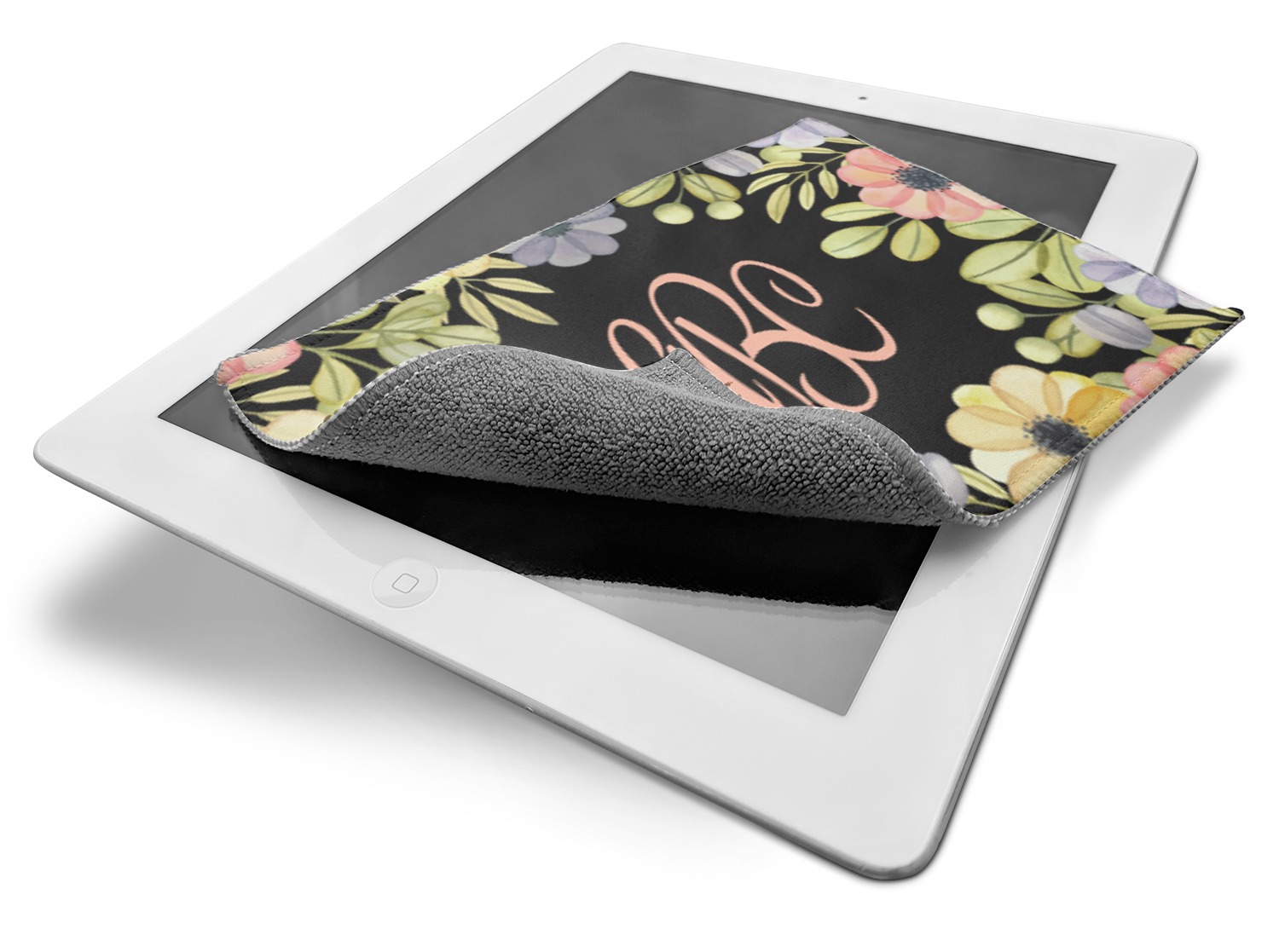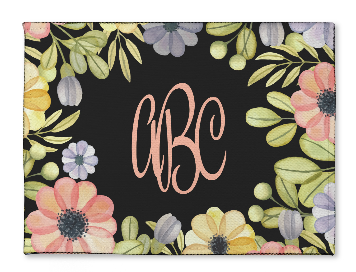 This design features a gorgeous black background with a frame of colorful wild flowers and greenery. You will find pinks, purples, and greens. But, if you were looking for other colors or types of flowers, be sure to take a peek in our design center at the other fun floral frame backgrounds we have. In the middle of this floral design you will find a three letter monogram to give an opportunity for our favorite thing: personalizing!