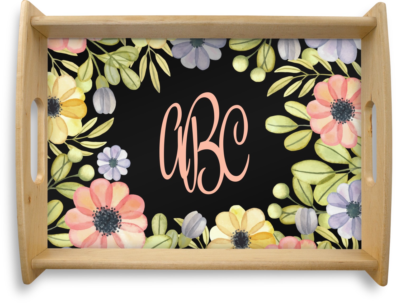 This serving tray with handles features square edges and two rounded sides, creating a very modern look. Each side is fabricated from a beautifully cut, natural wood. The bottom of the interior of the tray displays your customized design in bright, vibrant color. The tray is sold in both a black color and a natural wood look. Each variation of the wood serving tray has two sizes: Small, which is 14" x 10" x 2.25", and Large, which is 19.5" x 13.5" x 2.75".