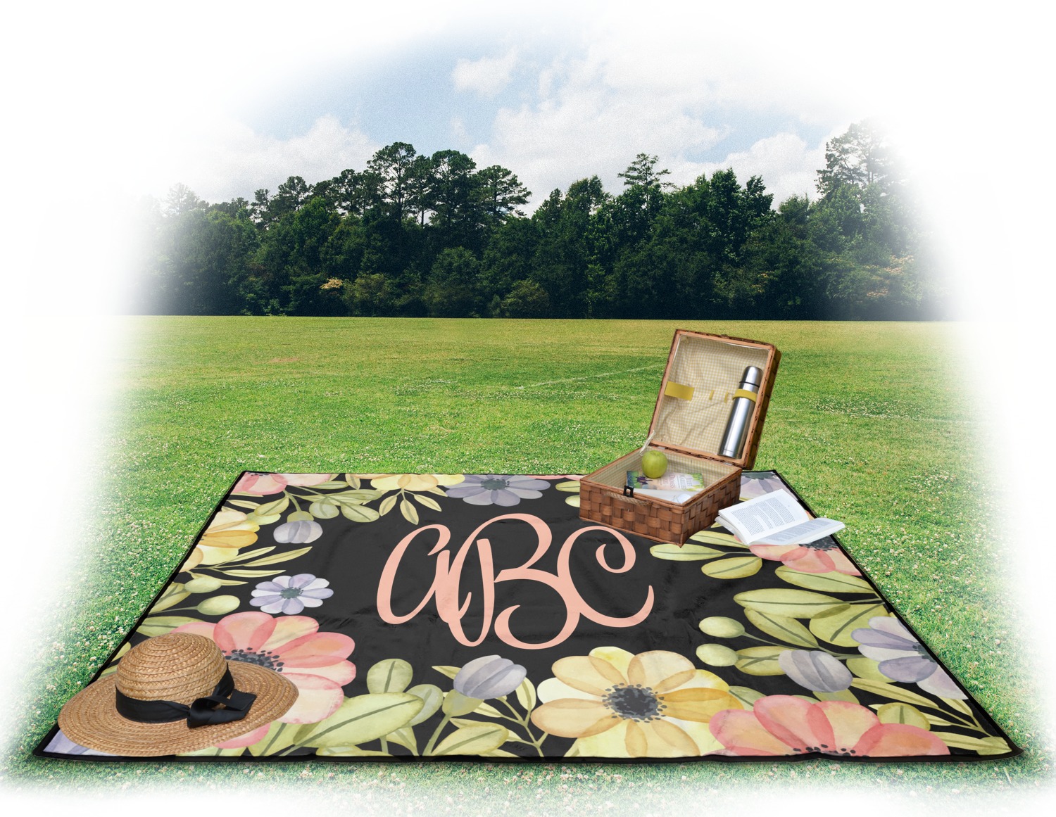 This picnic blanket is perfect for hanging out with your friends at the park or anywhere outside. The top of the blanket is made of a super soft microfiber fleece. The bottom of the blanket is made of a black material similar to a rain jacket and is water repellent as well. This will keep any wet spots on the ground from soaking through your picnic blanket. No one likes a wet blanket. The blanket measures at approximately 50" x 59" and has a nicely finished ribbon edge.