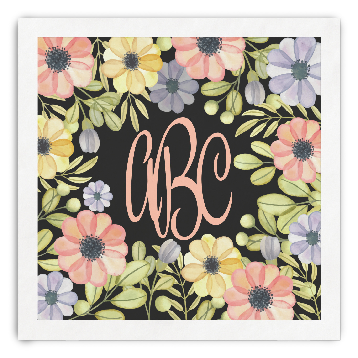 This design features a gorgeous black background with a frame of colorful wild flowers and greenery. You will find pinks, purples, and greens. But, if you were looking for other colors or types of flowers, be sure to take a peek in our design center at the other fun floral frame backgrounds we have. In the middle of this floral design you will find a three letter monogram to give an opportunity for our favorite thing: personalizing!