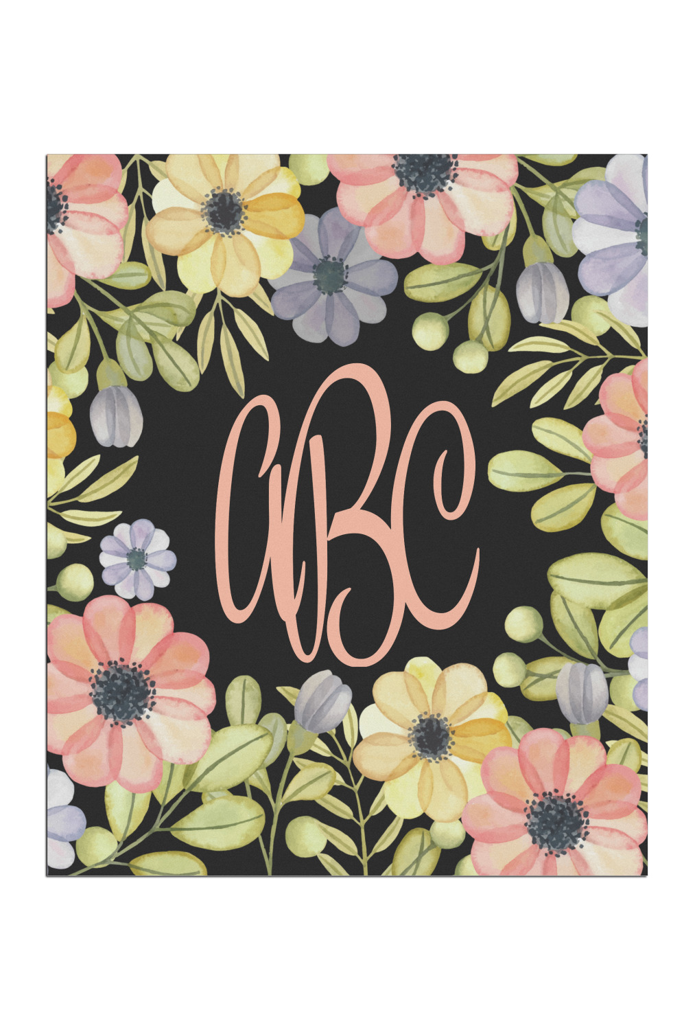 This design features a gorgeous black background with a frame of colorful wild flowers and greenery. You will find pinks, purples, and greens. But, if you were looking for other colors or types of flowers, be sure to take a peek in our design center at the other fun floral frame backgrounds we have. In the middle of this floral design you will find a three letter monogram to give an opportunity for our favorite thing: personalizing!