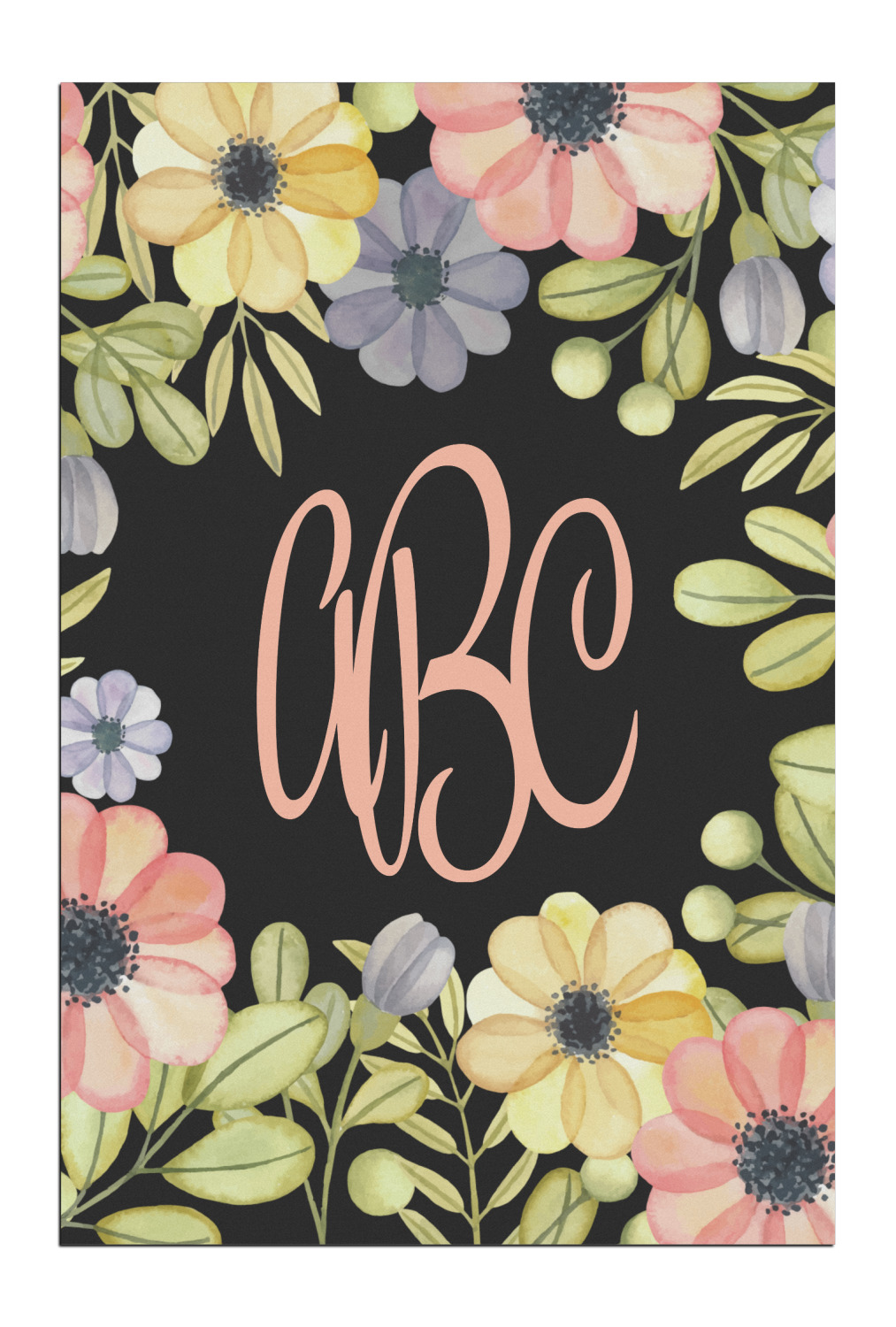 This design features a gorgeous black background with a frame of colorful wild flowers and greenery. You will find pinks, purples, and greens. But, if you were looking for other colors or types of flowers, be sure to take a peek in our design center at the other fun floral frame backgrounds we have. In the middle of this floral design you will find a three letter monogram to give an opportunity for our favorite thing: personalizing!