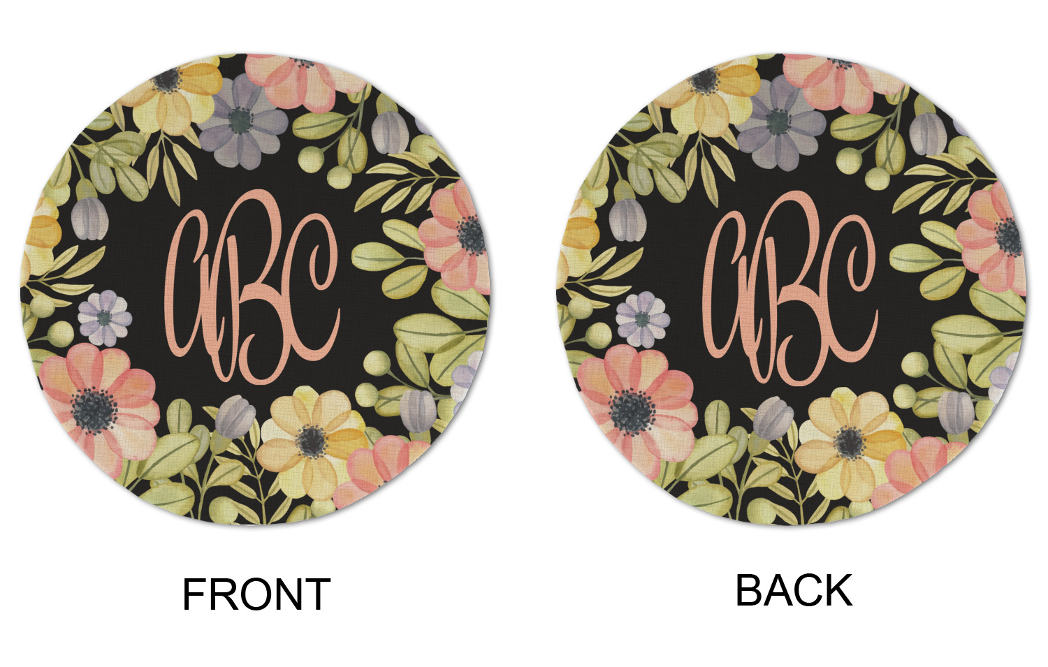 This design features a gorgeous black background with a frame of colorful wild flowers and greenery. You will find pinks, purples, and greens. But, if you were looking for other colors or types of flowers, be sure to take a peek in our design center at the other fun floral frame backgrounds we have. In the middle of this floral design you will find a three letter monogram to give an opportunity for our favorite thing: personalizing!
