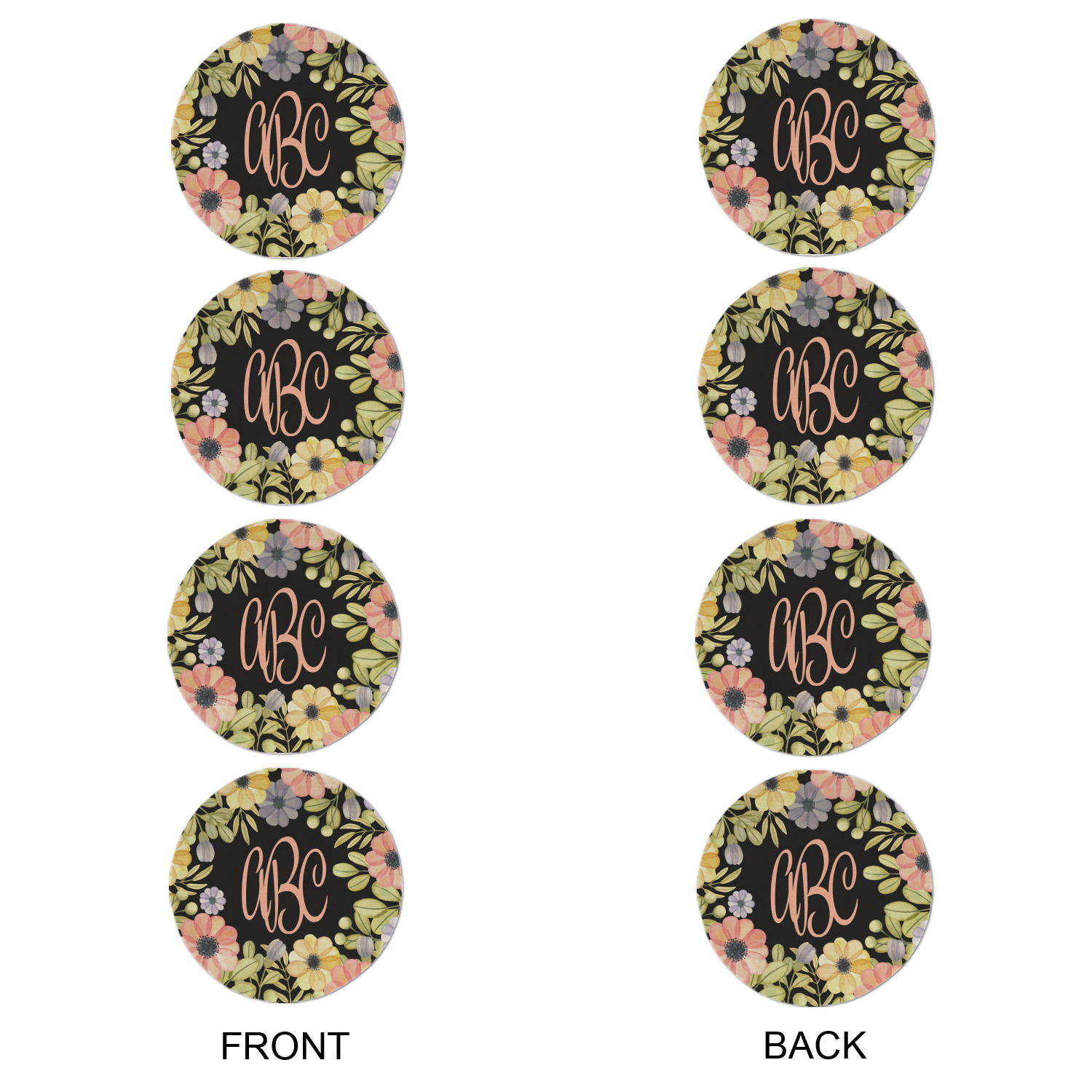 This design features a gorgeous black background with a frame of colorful wild flowers and greenery. You will find pinks, purples, and greens. But, if you were looking for other colors or types of flowers, be sure to take a peek in our design center at the other fun floral frame backgrounds we have. In the middle of this floral design you will find a three letter monogram to give an opportunity for our favorite thing: personalizing!