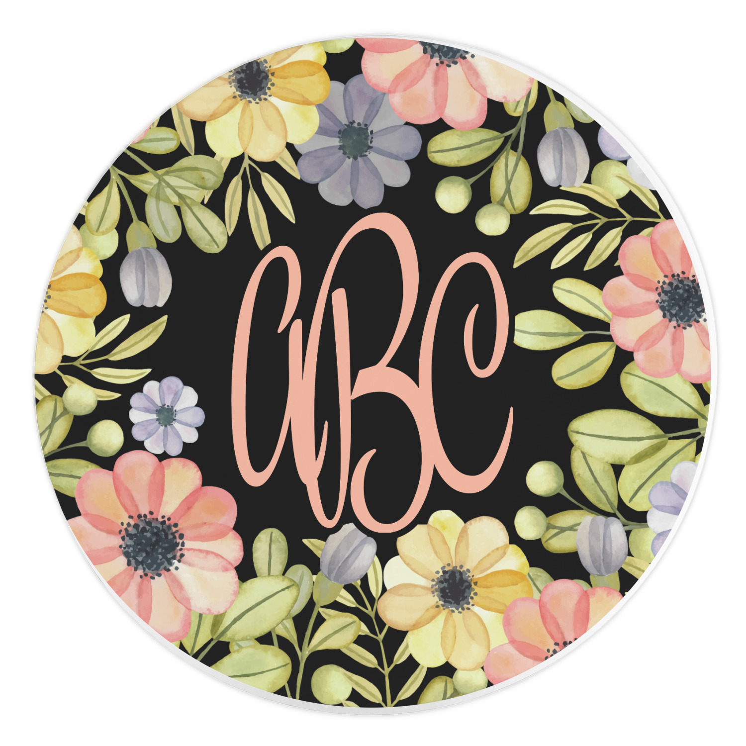 This design features a gorgeous black background with a frame of colorful wild flowers and greenery. You will find pinks, purples, and greens. But, if you were looking for other colors or types of flowers, be sure to take a peek in our design center at the other fun floral frame backgrounds we have. In the middle of this floral design you will find a three letter monogram to give an opportunity for our favorite thing: personalizing!