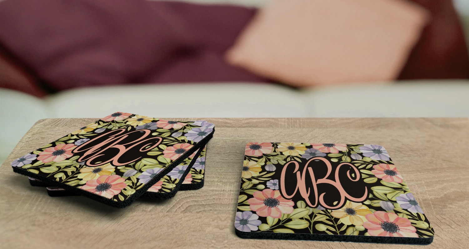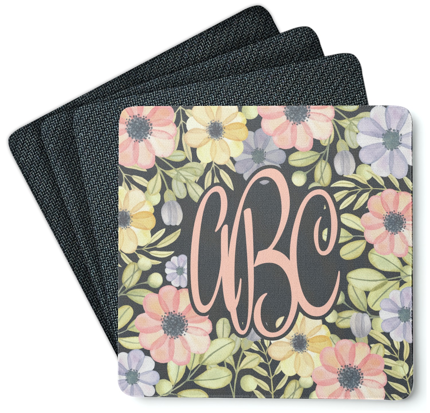 These drink coasters have a smooth, polyester top and a textured, rubber backing on its bottom. The non-slip rubber backing underneath works to keep any spills at bay. At 4 by 4 by 0.25 inches thick, these custom coasters are a suitable size for most drinkware. Your personalization is displayed atop the face of the cup coaster. We sell these rubber coasters in two different shapes: square and round. You can buy each shape as singulars or as a set of 4.